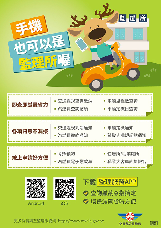 110年度自用汽車及機車燃料使用費已經公告開徵,宅在家上網連結「監理服務網」,或用手機下載「監理服務APP」,線上繳納免出門。臺中市監理站劉昌烈站長呼籲,民眾如需要洽辦監理業務,可多透過監理服務網或監理服務APP辦理,以網路服務代替臨櫃接觸,減少外出攜手防疫。