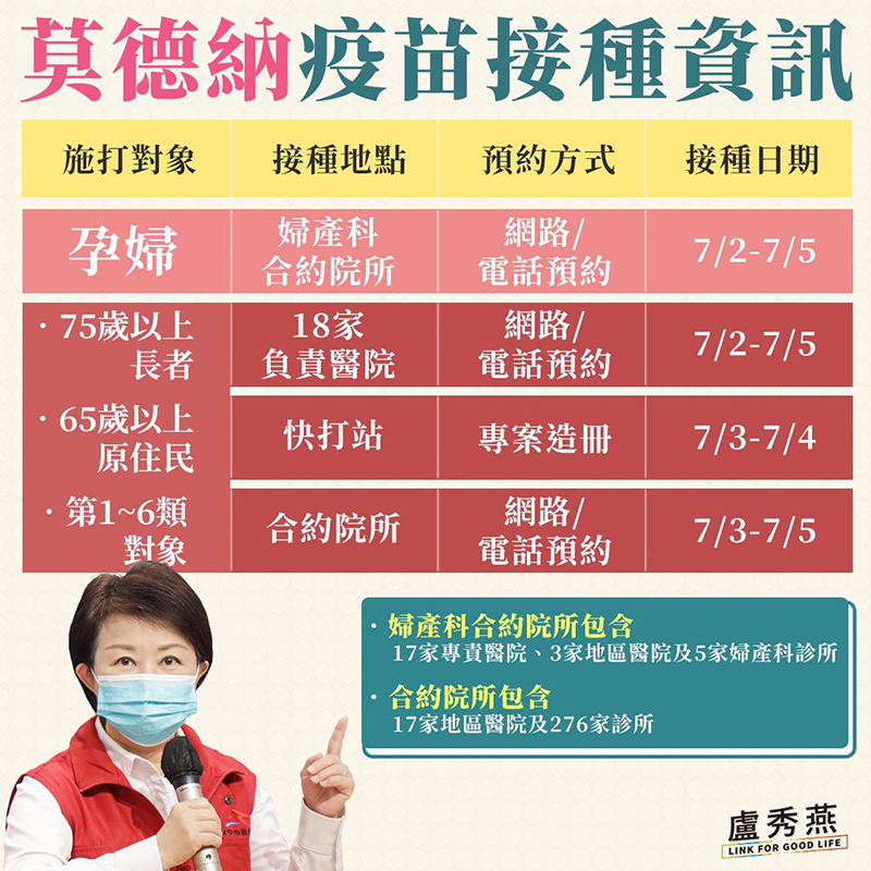 中央撥配台中9萬1420劑莫德納疫苗,今(7)日至9日同步於全市64處「疫苗快打站」為70歲以上長輩、60歲以上原住民及五大專案對象施打,台中市政府持續爭取疫苗配發量,讓人人都有機會接種。市長盧秀燕今日前往北屯區東山高中視察表示,首日大規模莫德納疫苗施打,長輩們施打意願非常踴躍,預估這一波疫苗施打率可能突破6成。
