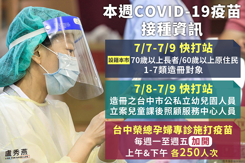 民政局長吳世瑋說明,戶籍在台中的70歲以上長輩,市府已統一造冊安排,今起一連3日在全市64個快打站為台中70歲以上長輩注射疫苗,請長輩記得攜帶「施打疫苗通知單」、健保卡、身分證,並填妥疫苗接種評估及意願書(隨通知書發放),依通知單標註的時間、地點前往快打站施打,注射完會拿到「COVID- 19疫苗接種紀錄卡」;他表示,這張紀錄卡很重要不能遺失,可作為未來相關驗證依據,也請家人幫忙注意,務必幫長輩保留。而戶籍在外地的70歲以上長輩可就近至各特約醫療院所及衛生所預約施打。
