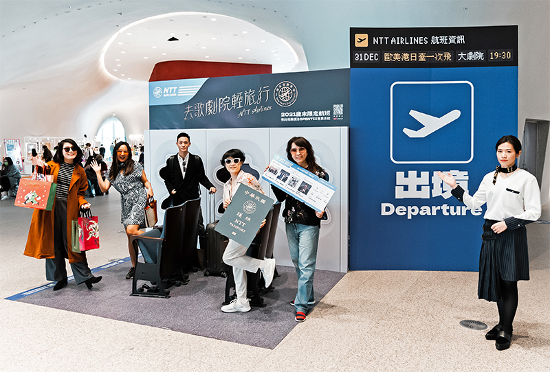 為讓觀眾、訪客都有「微出國」體驗,歌劇院大廳特別限時設置「歌劇院航空站NTT Airlines」,將2.5米高的出境指示牌、劇場座椅、大型機票與護照等道具搬到現場,打造獨家機艙空間,活動起跑才兩天就吸引超過百人拍照打卡,來館參觀民眾興奮表示「真的好像出國去!」,有人帶著行李箱來打卡、也有人感嘆裝置太逼真、扼腕沒有「盛裝」拍照。