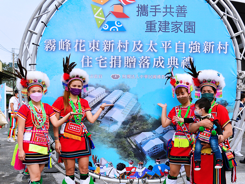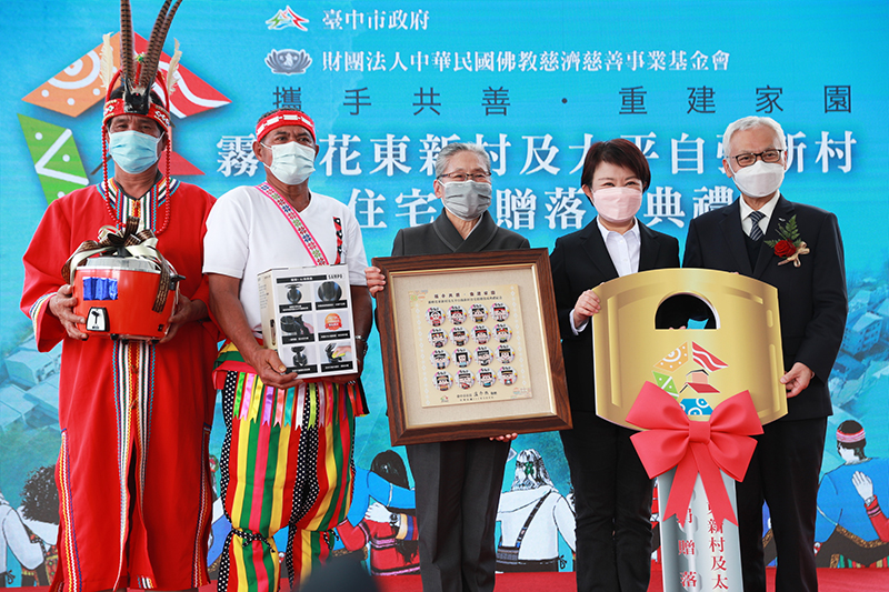 「過往梅雨季節,村中都是屋外下大雨、屋內下小雨,22年的期盼,感謝所有人士幫忙。」慈濟援建台中市霧峰區花東新村、太平區自強新村共95戶、2座活動中心,3月6日下午舉行捐贈落成典禮,由慈濟副總執行長林碧玉代表捐贈給台中市長盧秀燕。族人以迎定樂舞迎賓,市府與慈濟也準備入住禮,由盧秀燕市長、慈濟慈善事業基金會副執行長張宗義致贈給兩村住戶代表,住戶代表感謝所有協助他們安居的機關單位,與會人員還有原民會、林佳龍前部長、立委、市議員、當地公部門、民意代表等,一起祝福兩村一同建立永續新家園,場面溫馨歡樂。