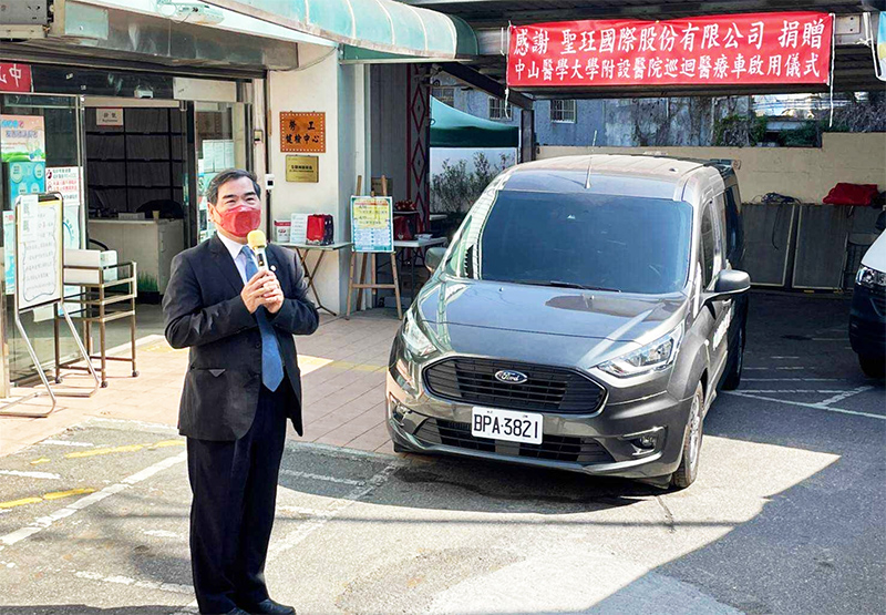 梨山地區於民國88年中橫公路歷經921強烈地震災後,中橫谷關至德基段嚴重坍方,常致使道路中斷而與外界隔絕,若民眾欲至臺中都會區看病,需繞道經大禹嶺,所花費時間長達5小時。伴隨IDS計畫的團隊成員在山地裡長時間賣力的奔波,醫療車輛的耗損快速,十餘年間汰舊換新已然邁入第四輛。為守護和平、梨山地區的民眾不受地理環境、距離影響而缺乏醫療資源,也為了讓民眾享有更好的醫療品質,聖玨股份有限公司響應政府關懷居民的情懷及體卹中山附醫竭力服務偏鄉的精神與熱忱,特此捐贈巡迴醫療車乙輛,希望藉此拋磚引玉,讓更多人看見山地偏鄉醫療的重要性。聖玨國際慷慨的捐贈,無疑是給予醫護人員安全上最直接的照顧,也為杏林更添光彩。