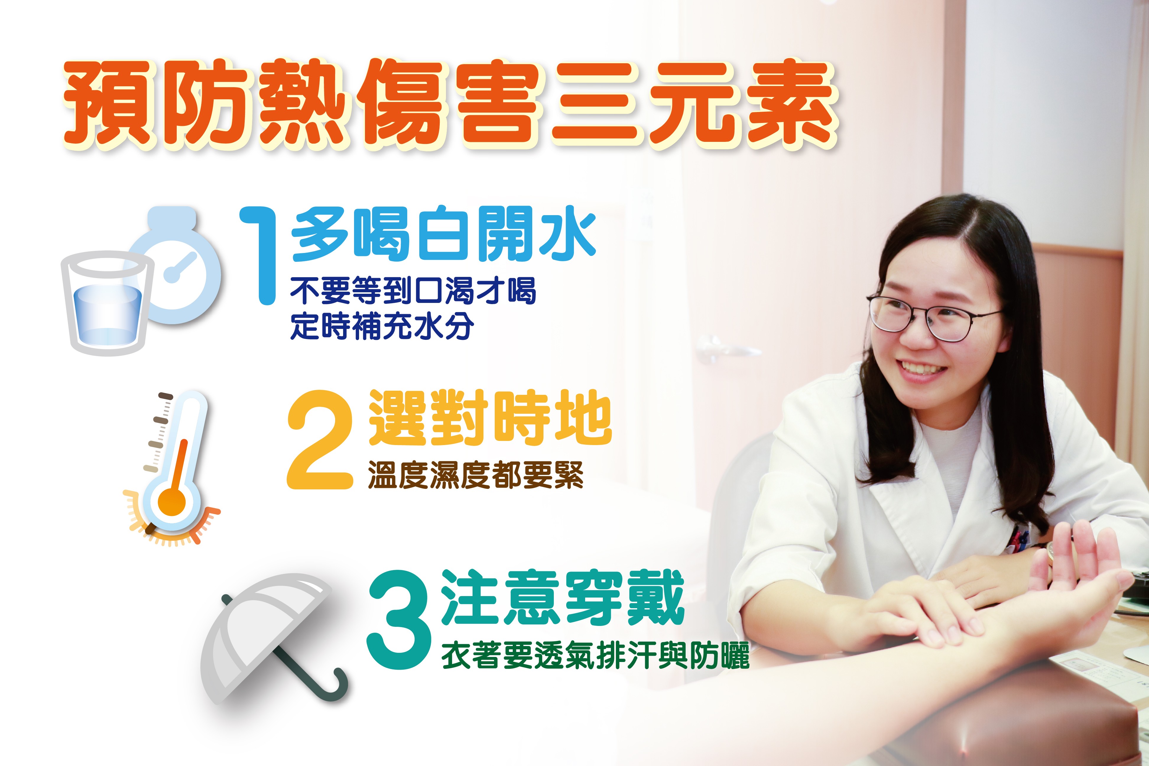 另外,炎熱氣候,人容易流汗,水分也容易流失,除電解質不平衡,高溫下也容易讓人昏沉和疲倦,甚至出現「氣短乏力」。鄭宇真醫師特別提醒夏至過後要懂得「避暑」。他提醒使用電扇、冷氣這兩種現代避暑工具,要注意幾個地方。第一、使用電風扇是要讓週遭環境產生對流,達到降溫的功能,不能貪涼長時間對著人吹,以免受到「風邪」。第二、冷氣最好調整到25到28度為佳,避免人體因為溫度過低而受寒。第三、不要頻繁進出冷氣房,防止呼吸道敏感不適。第四、衣著質料要舒適、排汗以利散熱,戶外活動注意補充水分和電解質,做好防曬,避免紫外線傷害皮膚。