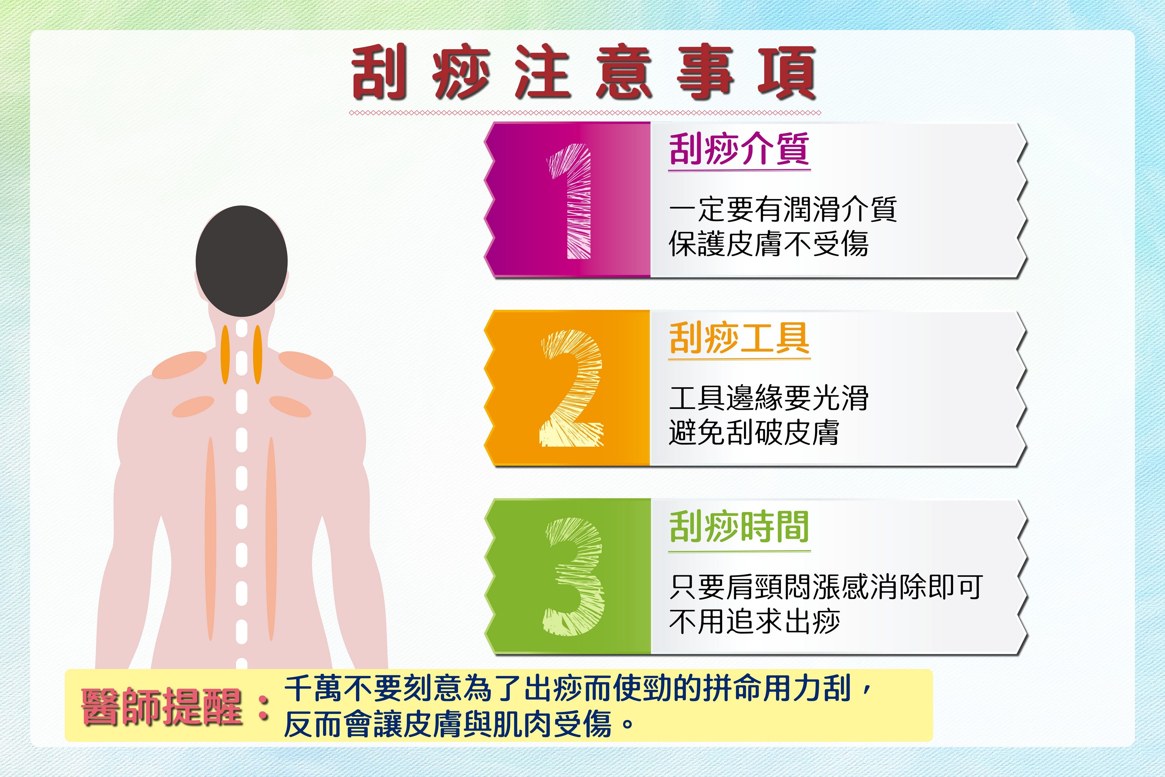 夏天天氣悶熱,常出現身體發熱、頭暈、頭痛、噁心、疲倦等症狀,很多人就會尋求「刮痧」清除鬱熱。鄭醫師說,刮痧有三個重點:第一、刮痧時一定要有凡士林等潤滑的介質,保護皮膚不受傷。第二、刮痧器具邊緣一定要光滑,例如瓷湯匙、刮痧板等,千萬不要用硬幣、鐵湯匙等,容易刮破皮膚。第三、要順著肌肉方向刮,通常以肩、頸與背部脊椎兩側肌肉膀胱經為主,只要感覺肩頸悶漲感消除就可以停止。鄭醫師強調,千萬不要刻意為了出痧而使勁用力刮,反而會傷到皮膚與肌肉。