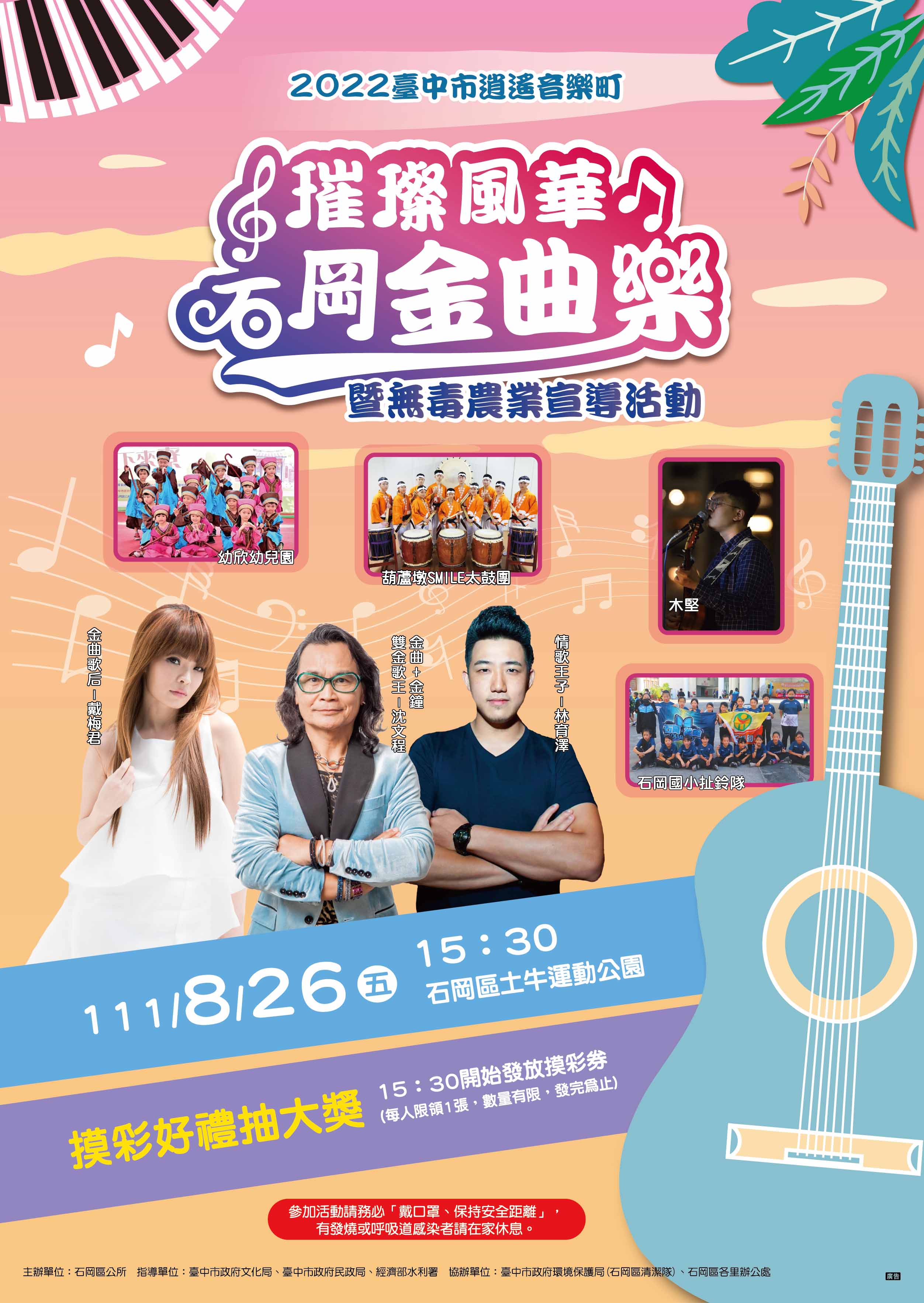 隨著暑假接近尾聲,由臺中市政府文化局與各區公所聯手舉辦的「2022臺中市逍遙音樂町」系列音樂盛會,將在本週末一連舉辦4場音樂會,分別於26日和27日(週五、週六)在石岡、和平、神岡及霧峰區帶來多元豐富的精采節目,歡迎民眾把握暑假最後週末前往欣賞。