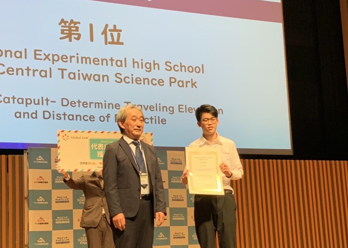 國立中科實驗高級中學日前選派學生赴日參加「つくば ScienceEdge2023」筑波國際科學論壇,分別榮獲 oral 組銀質獎與 poster 組第一名的嘉績,這也是台灣學生首次在筑波科學論壇的英語組海報報告競賽中奪冠,高二范哲熏同學以「Fly Away Catapult:Determine Traveling Elevation and Distance of Projectile(利用探討影響投石器投射效果因素)」為題,在英語組海報報告競賽得到第一名,並由大會特別推薦獲得 20 萬日元的補助金,即將於7 月 30 日參加在新加坡舉辦的「Global Link Singapore 2023」科學論壇。