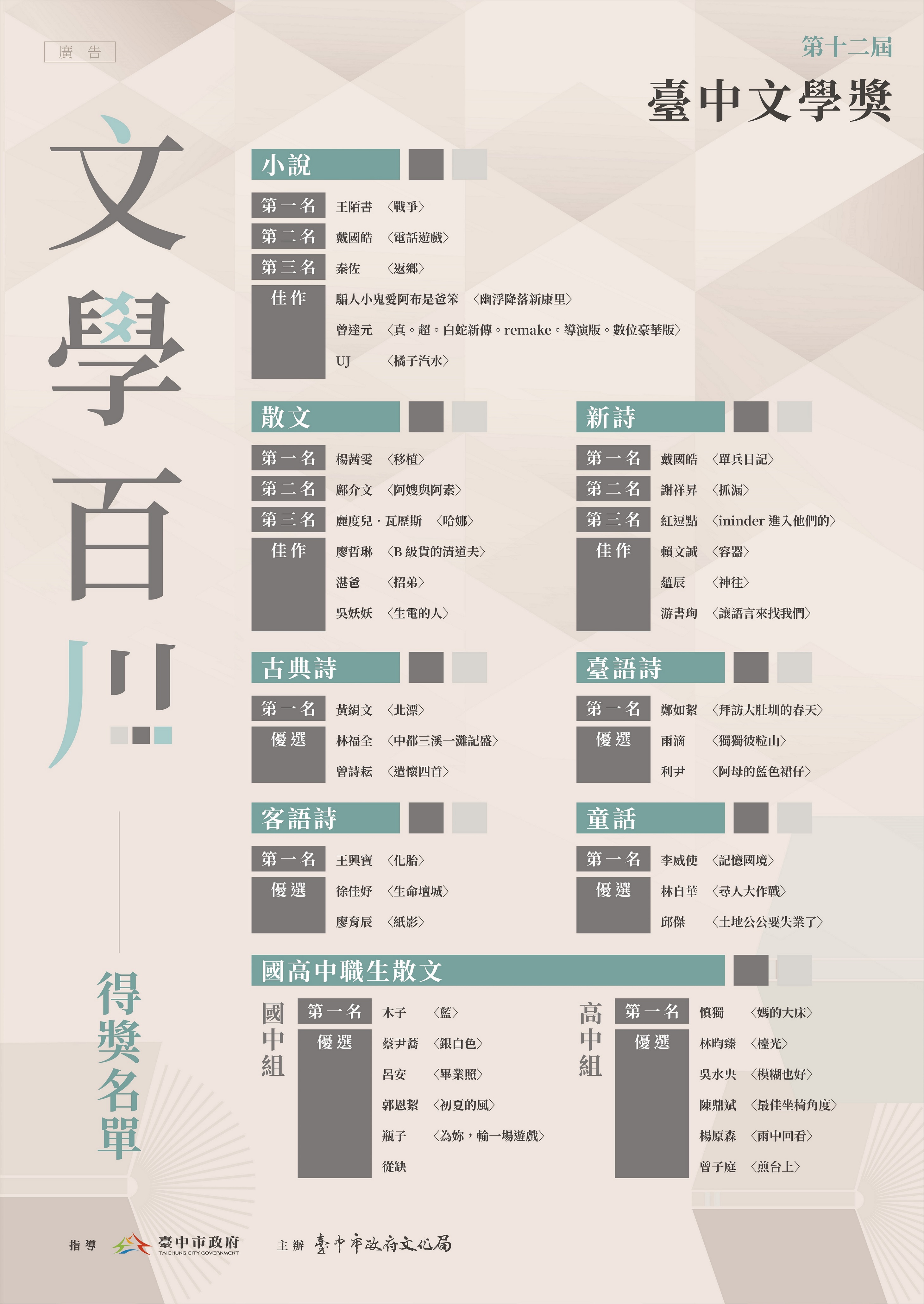 文化局說明,第12屆臺中文學獎完整得獎名單已於文化局官網(https://www.culture.taichung.gov.tw/)公告 ,頒獎典禮訂於11月26日於臺中文學館舉行,屆時得獎作品集也將同步發表。