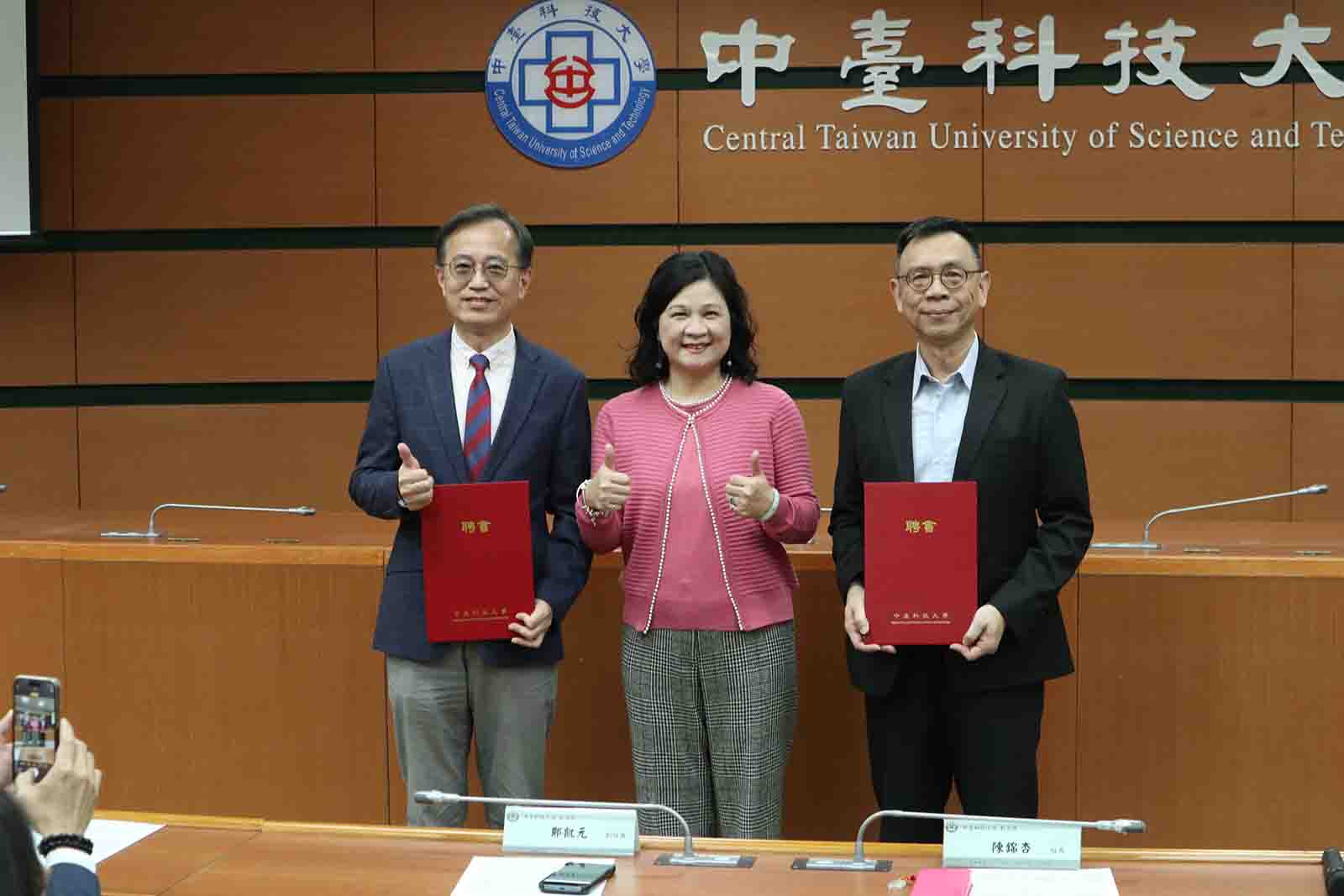 中臺科大陳錦杏校長(中)、鄭凱元副校長(左)及吳世經副校長(右)合影
