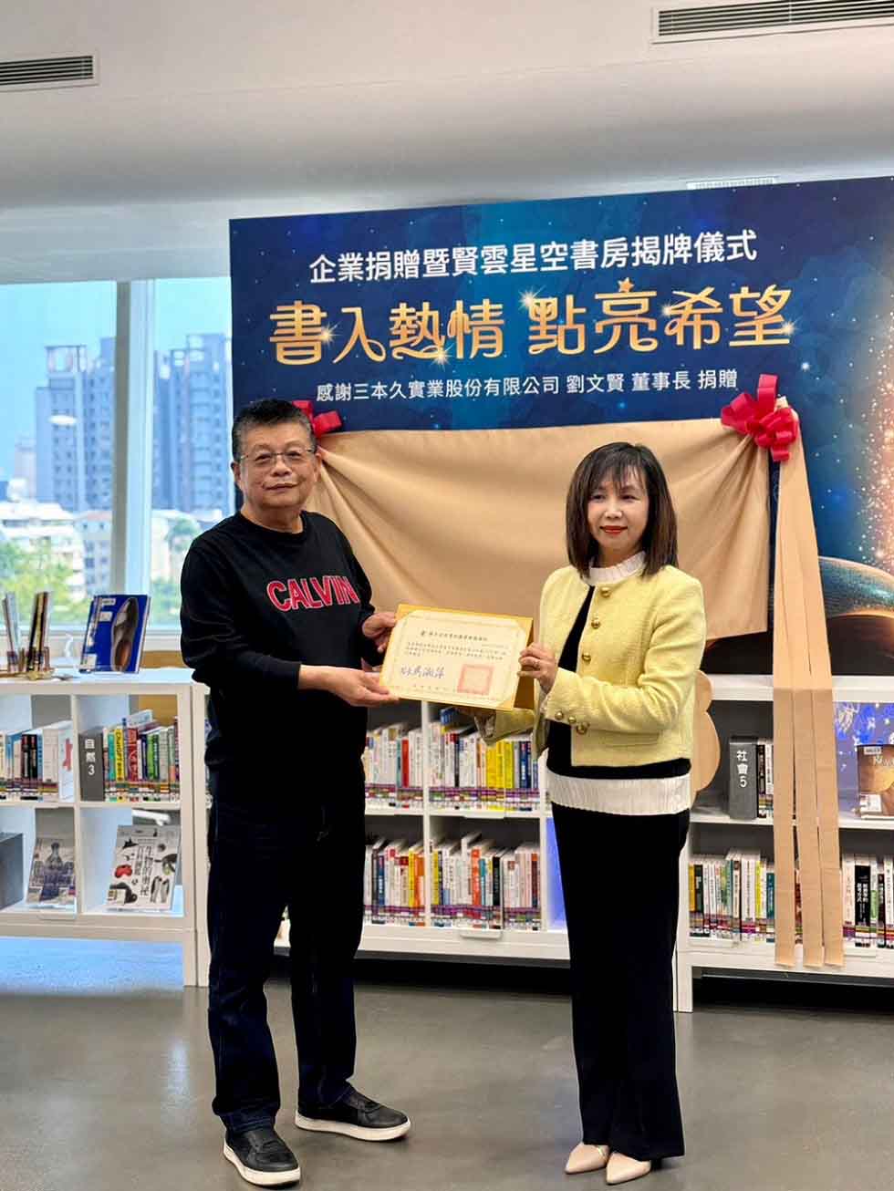 國資圖馬湘萍館長親自頒發感謝狀,表達對三本久實業股份有限公司劉文賢董事長感謝之意,並指出此次的企業捐贈,不僅豐富圖書館的藏書,也為讀者帶來無限的知識與啟發。期望如同「賢雲星空書房」之名,這個嶄新的書房裡每一本書都是知識的星星,在閱讀的星海中閃耀著前進的光芒,為每一位讀者帶來無限的可能與探索的樂趣。