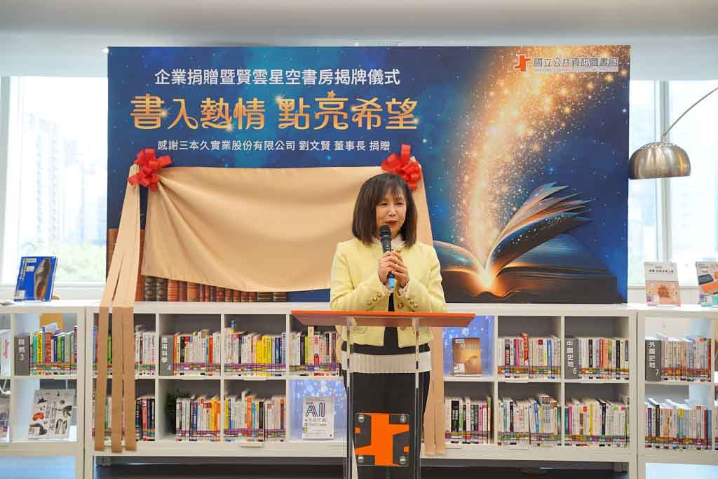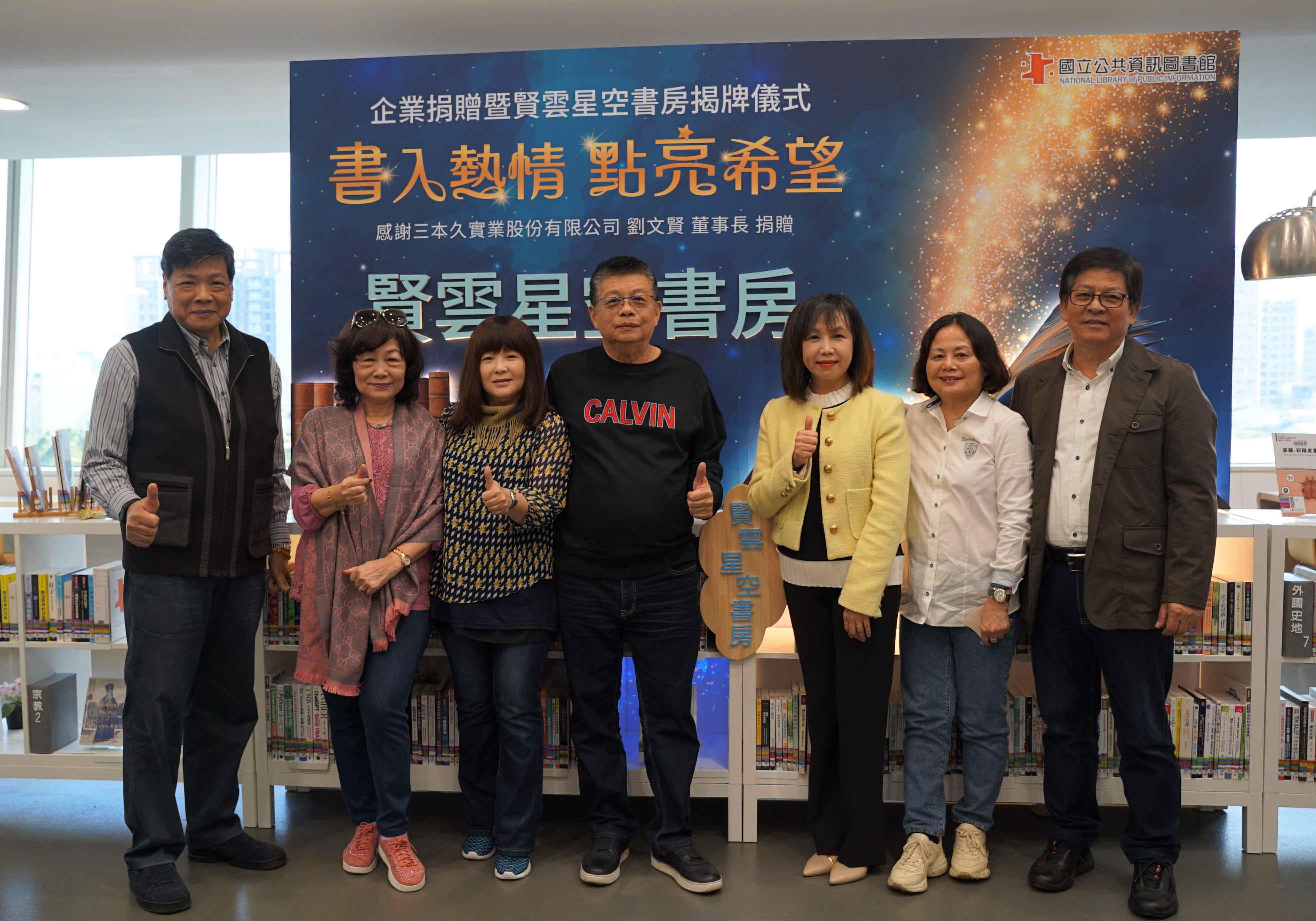 國立公共資訊圖書館於112年度獲企業「三本久實業股份有限公司」捐贈款項,購置共計3,287冊之新書,國資圖特設立「賢雲星空書房」專區,典藏此批捐贈圖書,並於113年1月20日(星期六)上午10時假國資圖5樓舉辦企業捐贈暨揭牌儀式。