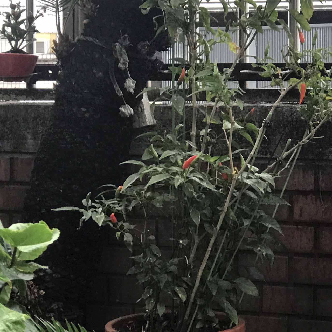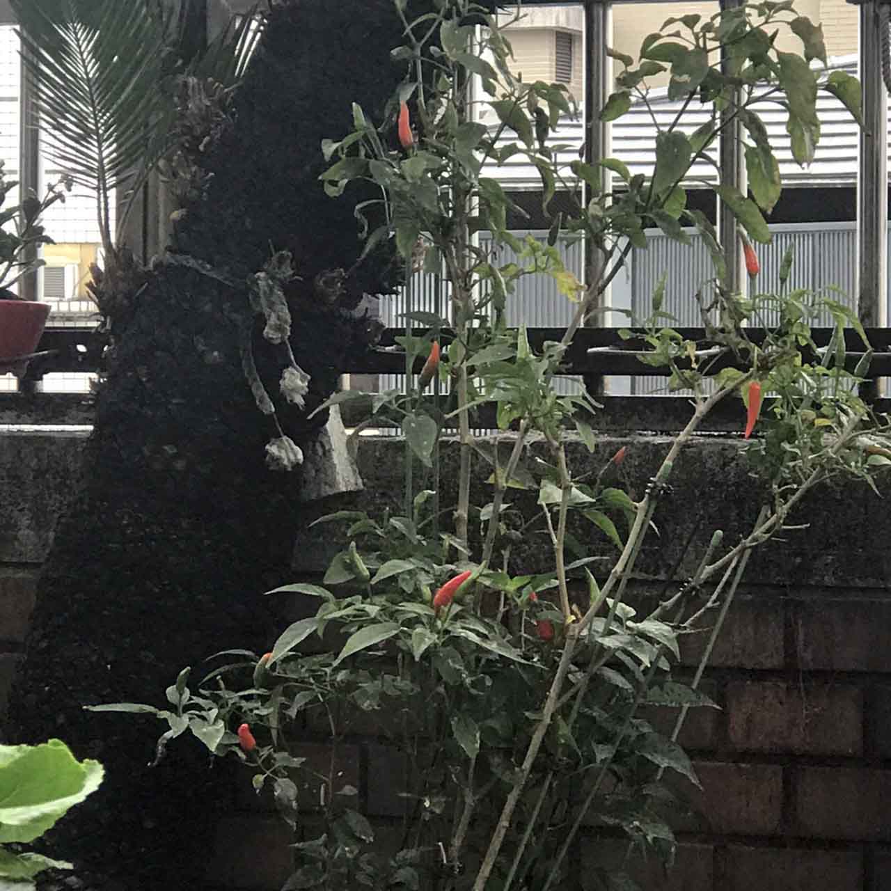 洪園小庭園有棵小小辣椒盆栽近四、五月來長出為數不少辣椒,有親友來訪也請他們順手摘下數條而回,雖不成敬意卻有無盡小小情意來分享情誼。