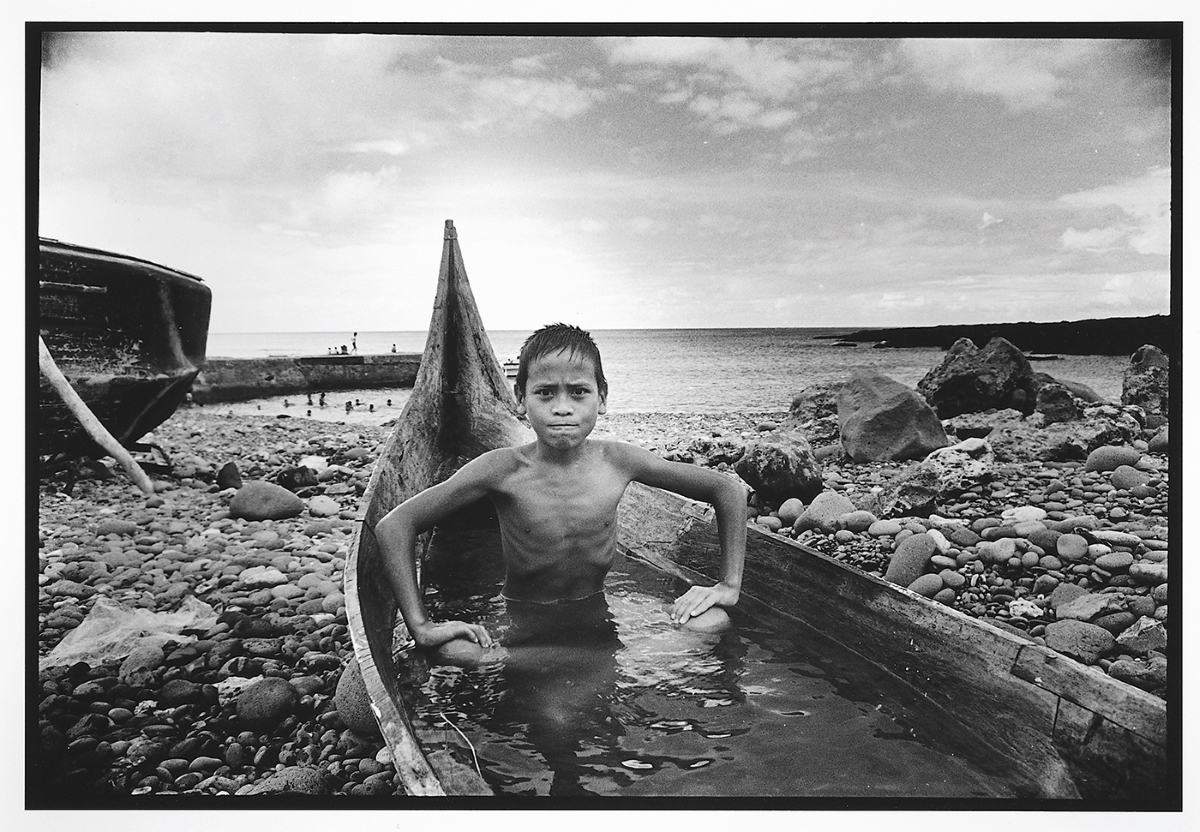 潘小俠,《蘭嶼記事》,〈坐在船上的小孩〉,1986,國家攝影文化中心典藏。潘小俠自1980年第一次踏上蘭嶼後,便與這個島嶼結下不解之緣,直至2022年再版