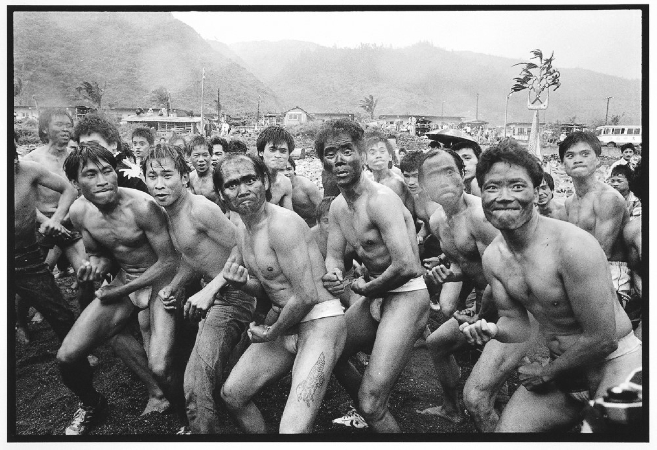 潘小俠,《漁人部落大船落成下水儀禮-驅逐惡靈》1988,國家攝影文化中心典藏。達悟族部落大船落成,畫面中的每個人都以猙獰的面貌、激動的身軀,並在不同的隊伍分列交錯時,彼此怒目瞪視激發著更顯強悍的動作與聲勢,如此威懾是為保護新船。