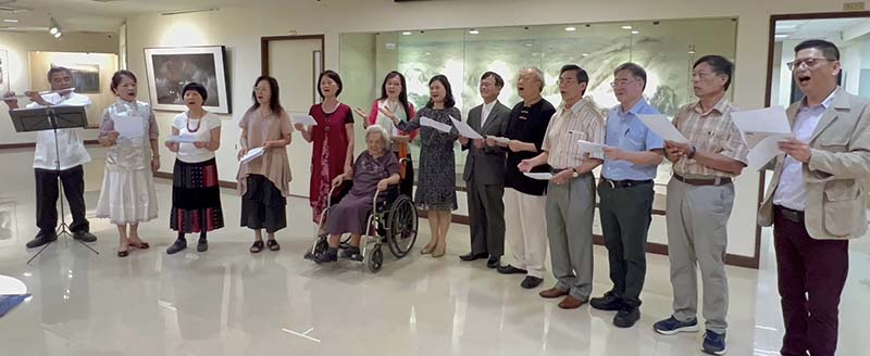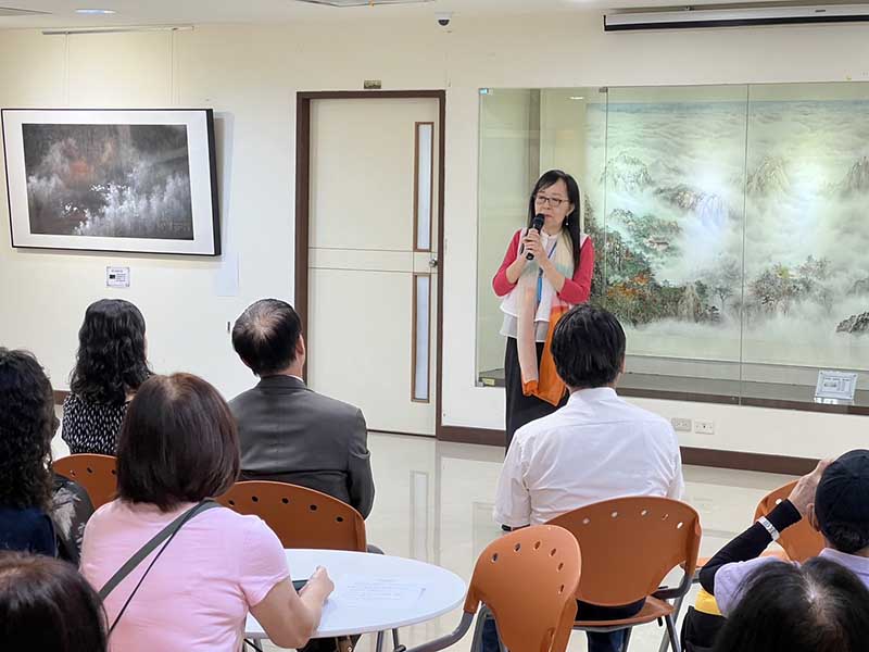 袁之靜老師曾任教於中臺科大,並長期在大坑地區教授水墨畫,現任「臺中市大坑麗澤文化資產研究學會」理事長。此次展出以袁之靜老師獨特創作風格和對水墨藝術的熱愛,在學術殿堂中帶來一場美學的饗宴,推廣書畫藝術之美,也為美學教育注入新活力,更是透過展覽實踐SDG 4優質教育,提升師生美學素養和藝術修養,進一步培育具備人文素養的優秀人才。袁之靜老師的水墨作品風格獨特,她挑戰傳統,不斷開拓新的藝術視野。展覽中,兩幅氣勢磅礡的瀑布及山景作品,充分展示宏大的格局,從傳統的山水花鳥到抽象的表現形式,展現出水墨畫的無限可能性,其中近期的抽象創作,在光影變化中蘊含深刻哲理,讓人流連忘返,品味無窮。袁之靜老師表示,她的創作靈感來自於天地、四時、萬物的和諧,並將禪意融入畫作,透過每一筆線條、每一次落墨,表達生命的樂章,展現出無限的生命力。