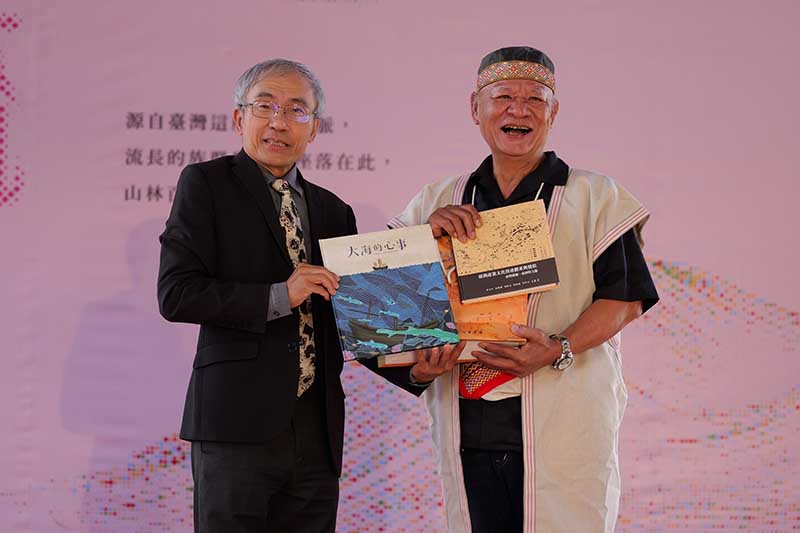 文化部文化資產局陳濟民局長(左)致贈邵族保存修復精選出版品,由毛隆昌祭司(右)代表接受