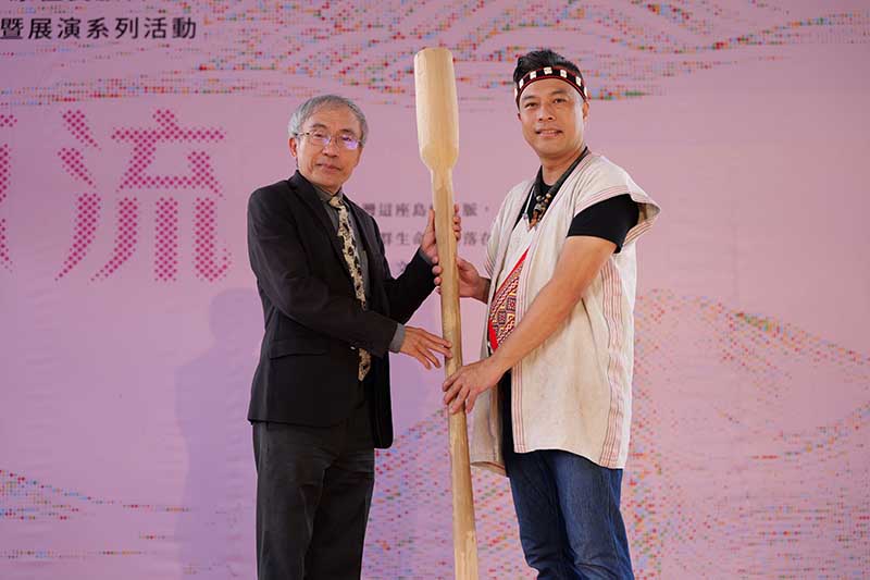 邵族製杵工藝師 石嘉聖(右)與文化部文化資產局 陳濟民 局長(左)藉由木杵展示合作深化兩方情誼