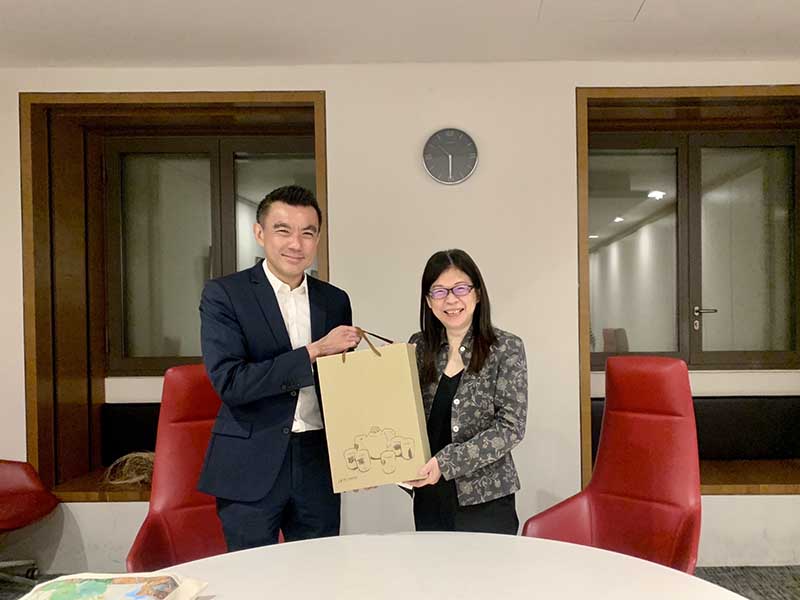 國美館館長 陳貺怡(右)致贈國美館文創品予新加坡國家美術館館長 陳維德(Eugene Tan)