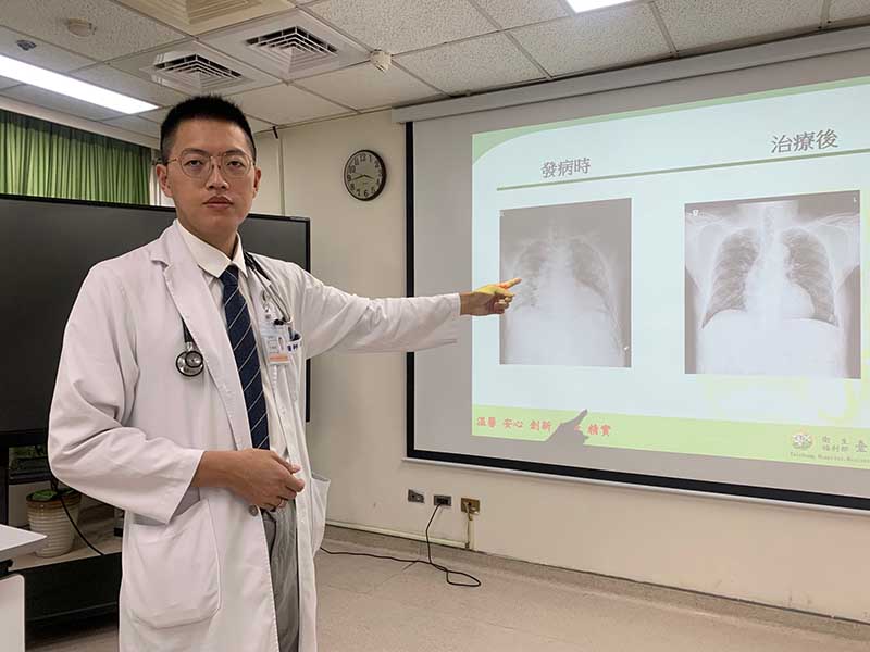 急診室醫師照x光一看,患者雙肺都白了,血氧濃度嚴重低下到出現急性呼吸窘迫症,緊急送進加護病房搶救,醫療團隊以高流量鼻導管給氧改善他血氧濃度嚴重低下問題,合併抗生素、類固醇藥物治療,一周後轉出加護病房,隔週病況穩定才出院。