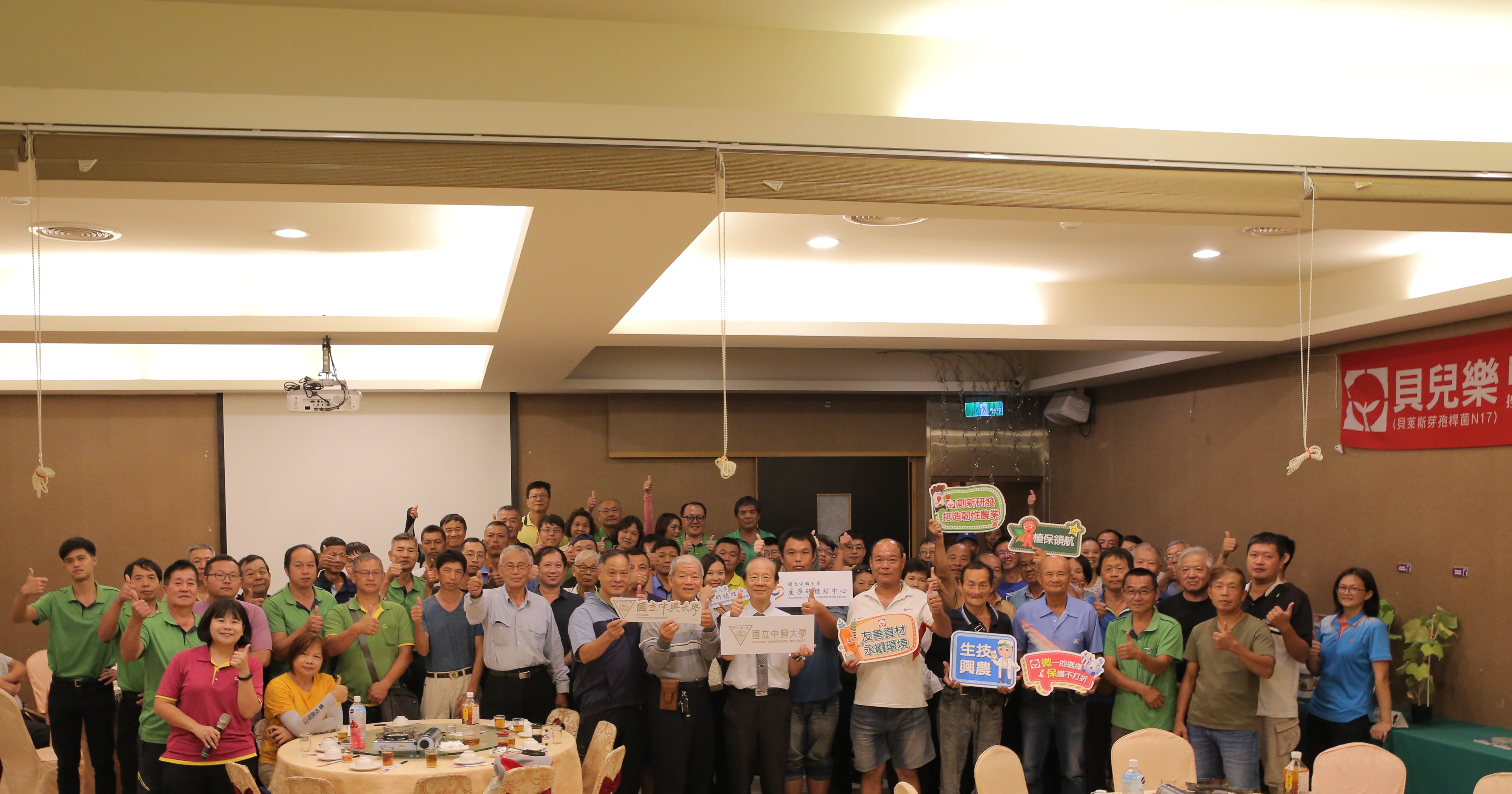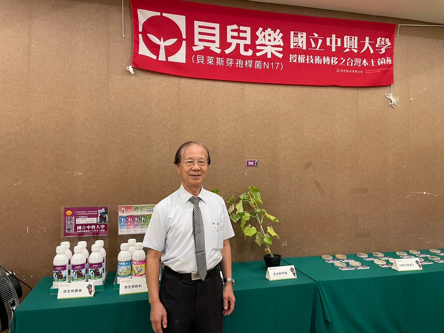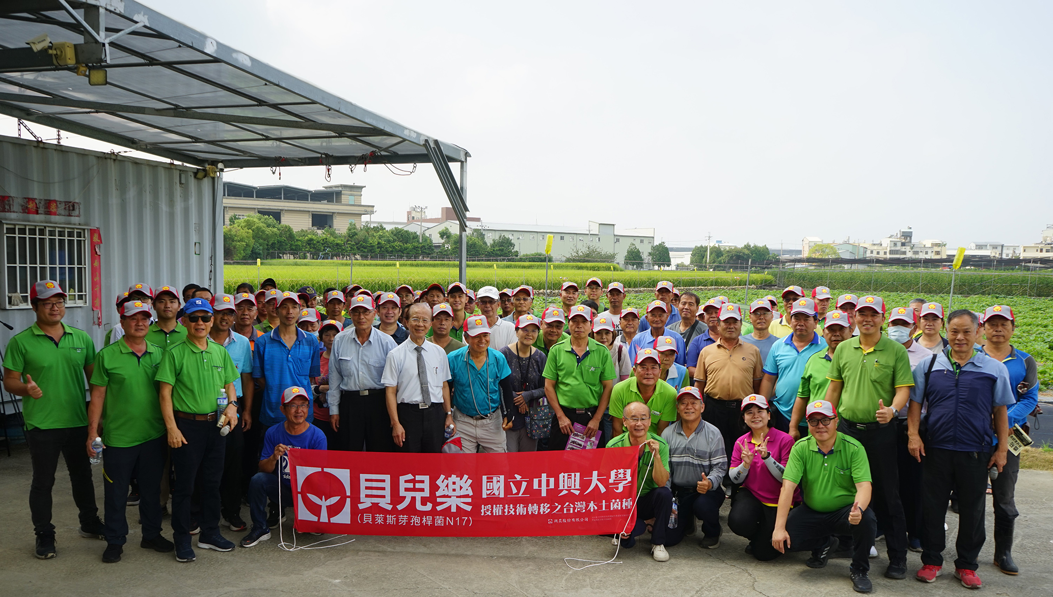 中研院院士、中興大學土環系楊秋忠教授研發之「抗菌微生物菌株及培養繁殖技術」,技術移轉給興農股份有限公司,興農10月22日在霧峰安美農場舉行興農全新微生物農藥貝兒樂(貝萊斯芽孢桿菌N17)新產品上市田間觀摩會。
