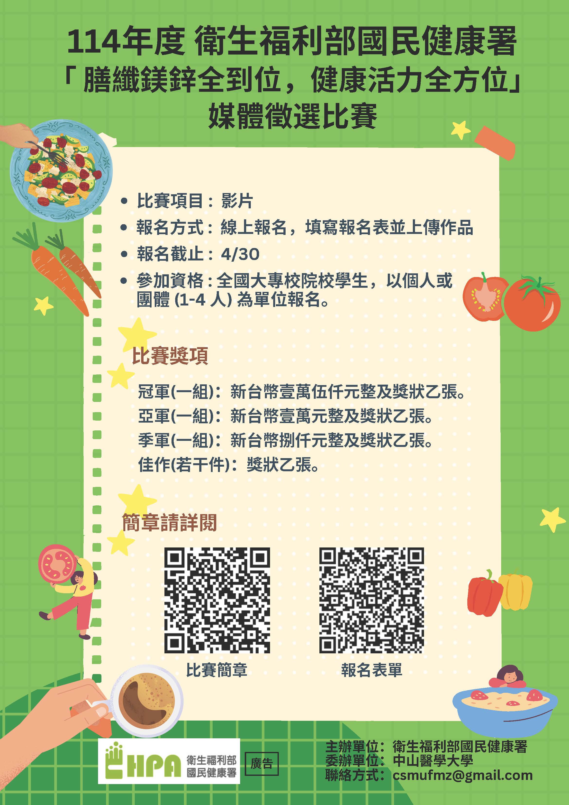114膳纖鎂鋅全到位,健康活力全方位」媒體製作徵選比賽海報