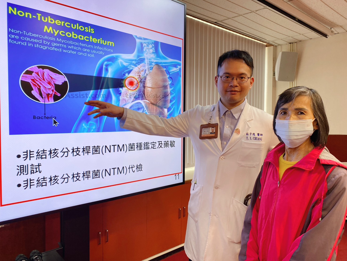 另一名65歲孫女士在外院X光檢查中發現肺部多個結節,開刀切片顯示為乾酪樣肉芽腫性發炎,診斷為肺結核。經5個月治療後,病患飽受藥物副作用困擾,追蹤檢查發現肺結節不減反增,轉介臺中榮總胸腔部分枝桿菌中心,醫療團隊為她手術取得完整檢體,確診為非結核分枝桿菌感染,不是結核分枝桿菌是不會傳染且可控制的疾病,讓她卸下傳染疾病的心理負擔,也避免不必要療程和藥物副作用。