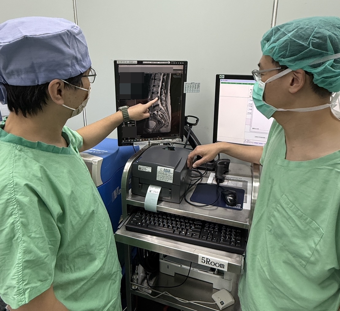賴烱文主任為求謹慎,安排陳女士進行腰椎核磁共振(MRI)檢查,結果發現於腰椎第四第五節位置有一巨大椎間盤突出,且碎裂的椎間盤已往頭端方向游離,直接壓迫神經根,難怪保守治療效果有限。由於考量神經功能受損的風險,立即轉診至該院腦神經外科施育彤主任進一步處理。