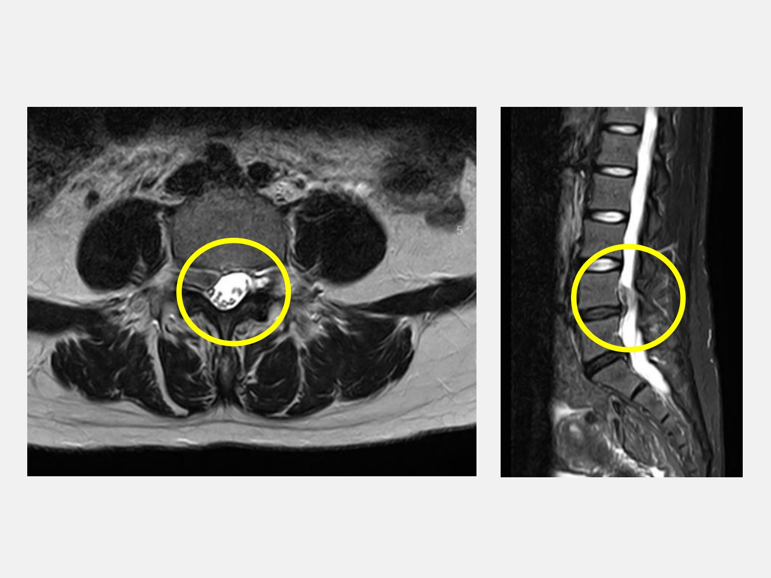 施育彤主任接手後,詳細檢視陳女士影像,並進行神經學檢查,確認症狀與椎間盤碎裂壓迫位置吻合。施育彤主任指出,雖然陳女士經過合適的疼痛治療,但是當壓迫嚴重、神經功能開始下降時,手術介入就成為必要的選項。特別是這類游離型、往頭端移動的椎間盤碎片,常造成診斷與處理上的困難。