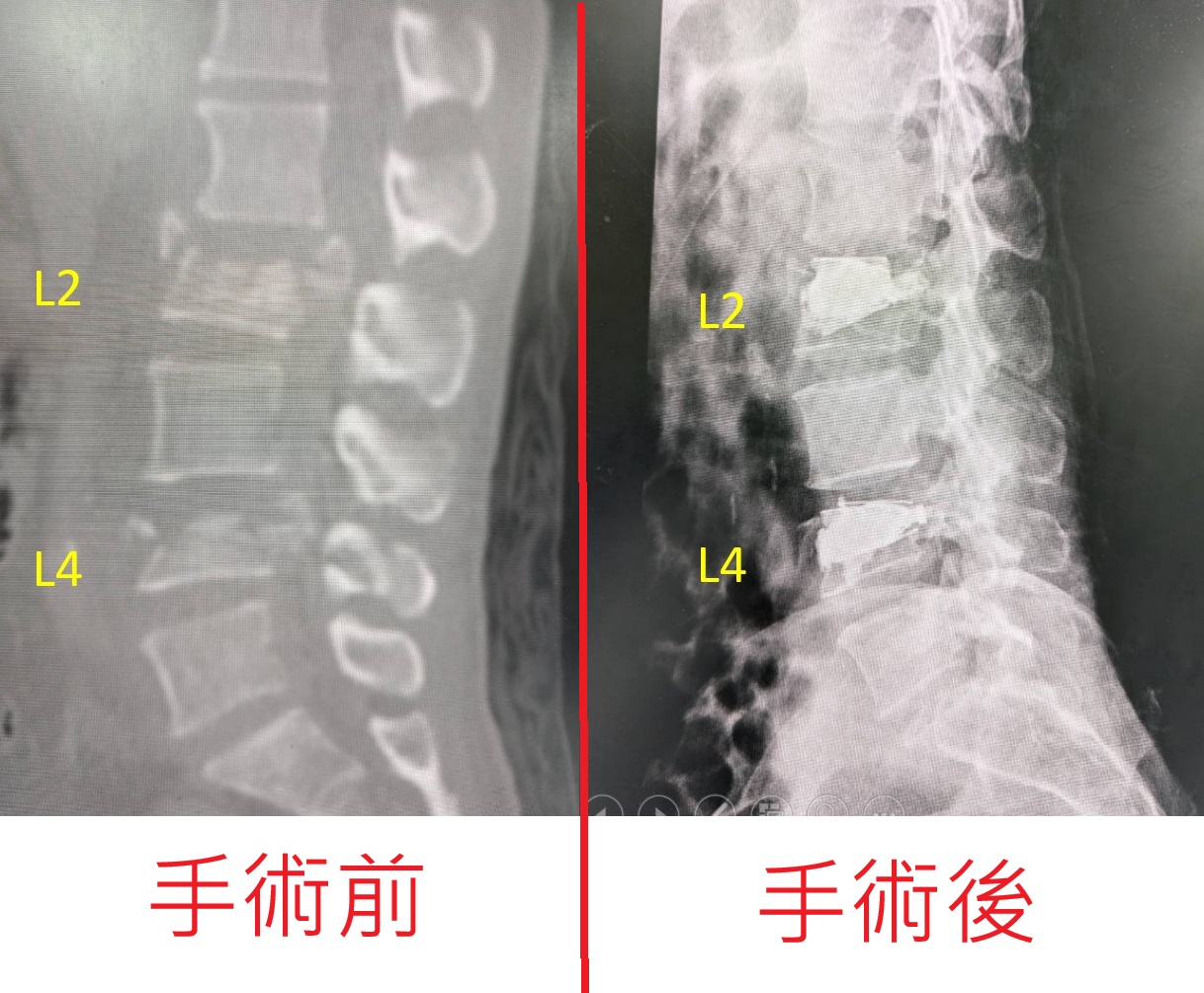 手術過程於每節脊椎置放2支千斤頂,單支可有100公斤的支撐力,千斤頂單支手術傷口僅1公分,出血量不到10C.C.,每節椎體放置2支便具有高達200公斤向上撐開的力量。劉姓婦人共於第二及第四腰椎放置4支千斤頂,同時也接續進行右腕,左肘骨折及臀部傷口手術,術後疼痛極其輕微,隔天就能立即進行復健訓練。相當積極復健的她,術後一個月就能使用助行器練習走路,且能正常大小便,三個月後完全恢復,非常開心能夠重拾正常生活。