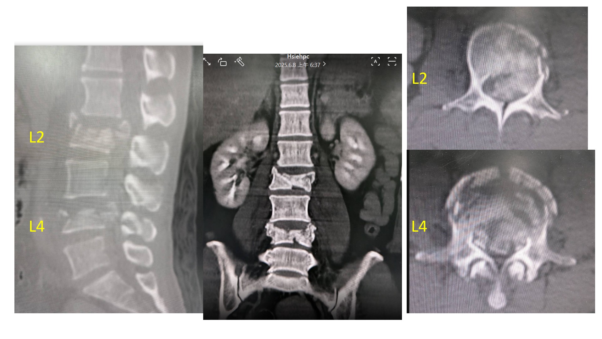 烏日林新醫院骨科謝博欽主任表示,根據劉姓婦人的電腦斷層檢查顯示,第二及第四腰椎出現爆炸性骨折,且椎骨碎片擠壓脊椎孔僅剩10%的空間,另外合併有右手腕橈骨骨折、左手肘脱臼合併橈骨頭骨折、左跟骨骨折、左骨盆恥骨骨折,傷勢極為嚴重。此外更有鋭物插入右臀部深達15公分的穿通傷,所幸未傷及肛門與膀胱。當下只剩腳趾尚能活動,臨床上呈現「脊髓圓錐症候群合併馬尾症候群」,屬於不完全脊髓損傷,情況相當危及若未把握黃金時間盡快進行手術,極有可能演變為永久性癱瘓。