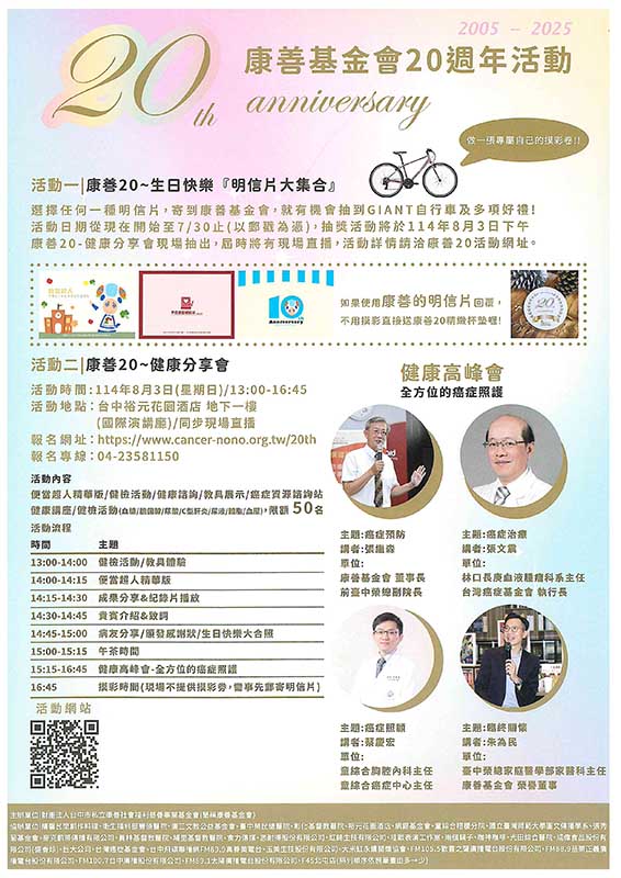 康善20健康分享會,這次最特別的就是健康高峰會,根據不同主題,邀請康善基金會張繼森董事長、台灣癌症基金會張文震執行長、童綜合癌症中心蔡慶宏主任、臺中榮總家庭醫學部家醫科朱為民主任,從預防、治療、照顧、安寧,一次性將癌症全方位照護在一個半小時完成,每個醫師都將畢生所學濃縮精華,在20分鐘內呈現,屆時絕對是精彩可期(活動詳情可上活動網頁查詢(https://www.cancer-nono.org.tw/20th/,或是電話洽詢04-23581150)。