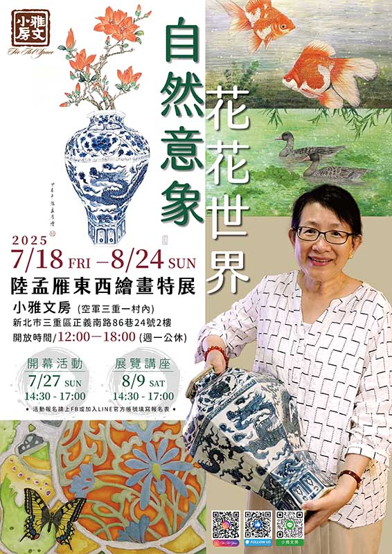 藝術家陸孟雁《自然意象.花花世界》東西繪畫特展,已於本月18日正式於新北市空軍三重一村的「小雅文房」開展,27日舉行開幕活動,有多位藝術家及企業家共襄盛舉,展期至8月24日止。本次展覽橫跨東西藝術風格與文化視野,呈現陸孟雁老師多年來在工筆創作、人文觀察與異國旅行中的深刻體會與文化探索的藝術旅程。陸孟雁老師現職為大學西語系老師,著有《漢西翻譯面面觀:理論與實踐》、譯有《不可思議的澳洲原住民神話傳說》、《話說淡水》等書;自幼喜歡畫畫,師承繪畫大師野農、李奇茂及張克齊。 除了過去曾多次展出畫作,目前也是蘭印藝廊的創辦人。