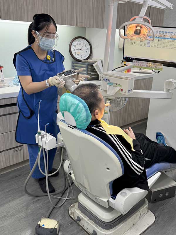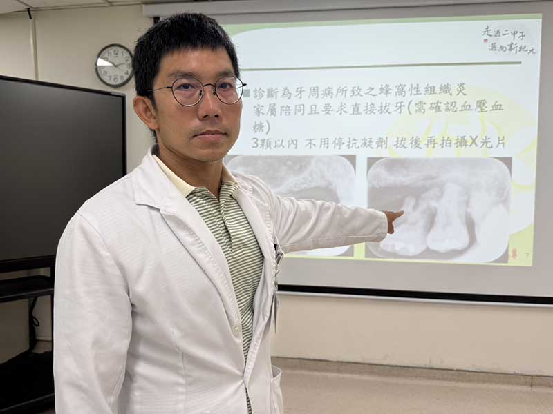 沒想到蛀牙菌感染迅速蔓延,左臉越腫越大還發燒,家人不放心先帶他到附近牙科診所看牙,但診所擔心治療風險轉診到本院,經牙科團隊先透過移動式X光檢查,確定他是左上大臼齒因蛀牙未處理導致蜂窩性組織炎,在家人同意下拔除搖搖欲墜的蛀牙,並現場觀察30分鐘確定沒有持續出血風險才讓他返家,上週回診已經退燒且恢復正常。