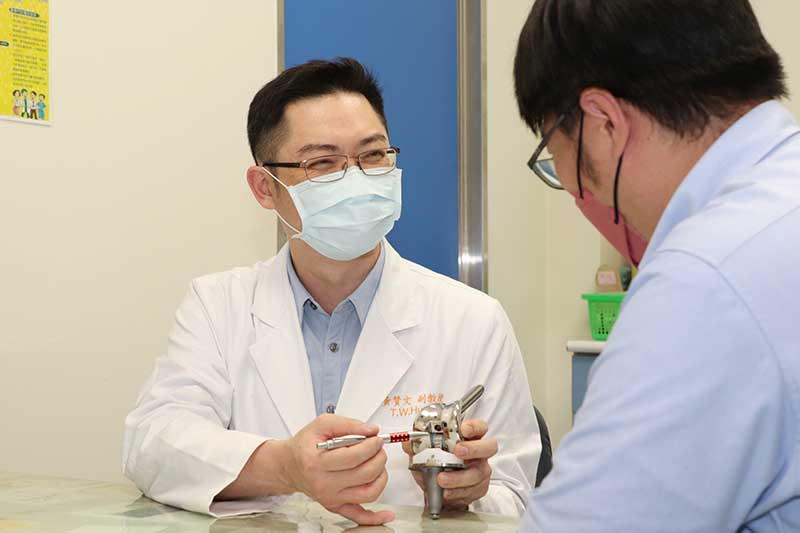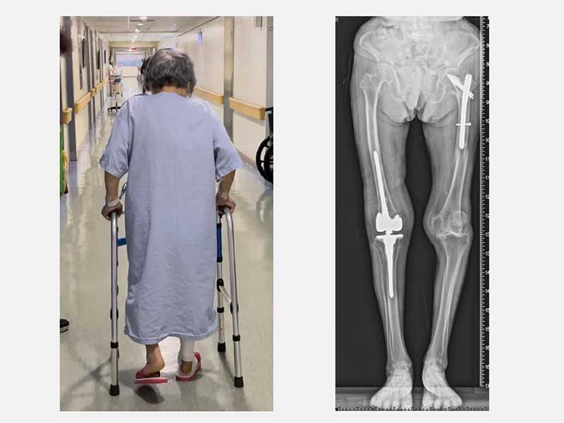 由於老太太的骨質疏鬆嚴重,不僅是粉碎性骨折也連帶傷到膝關節的韌帶。黃部長使用新式預鎖式樞紐設計的人工關節,可以取代韌帶的功能也可填充骨頭缺損來重建一個穩定的膝關節。老太太手術當天下午就可以自己拿著助行器下床上廁所。此外,從手術隔天開始,除了骨質疏鬆症的治療,還搭配手術後疼痛中醫輔助醫療,復健科醫師也根據老太太的需求安排復健運動,在病床邊開始固定式腳踏車訓練。在手術後第5天,老太太開心的出院走路回家。