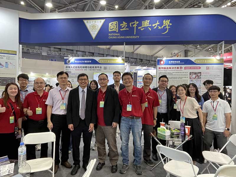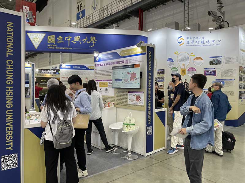 國立中興大學展區亮點成果豐碩,涵蓋農業科技、醫療創新、動物健康、功能性食品及智慧醫材等多元領域,突顯其跨域整合與產學合作研發量能;校內研究團隊謝昌衛終身特聘教授團隊結合微氣泡清洗、智慧辨識以及仿生包裝的農產品採收後保鮮技術, 不但可取代傳統除蟲方式以及解決目前化學藥劑殘留問題,有效降低果實上介殼蟲檢出比率,減少水果出口前的害蟲防治措施。童鈺棠副教授團隊展出的黑紅營養力,致力於挖掘如黑豆與台灣藜等本土超級穀物的潛能,作為健康促進與創新素材之重要關鍵,並提供功能性食品開發之科學依據。