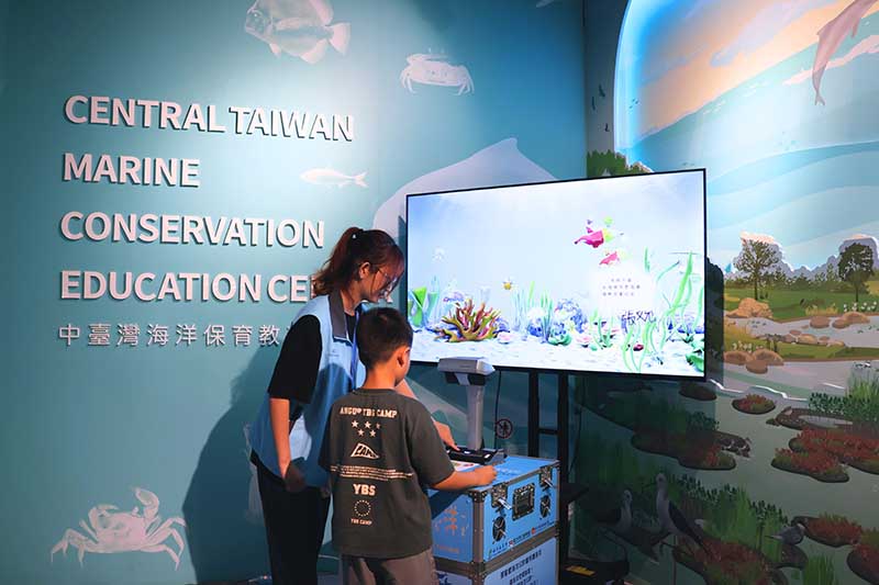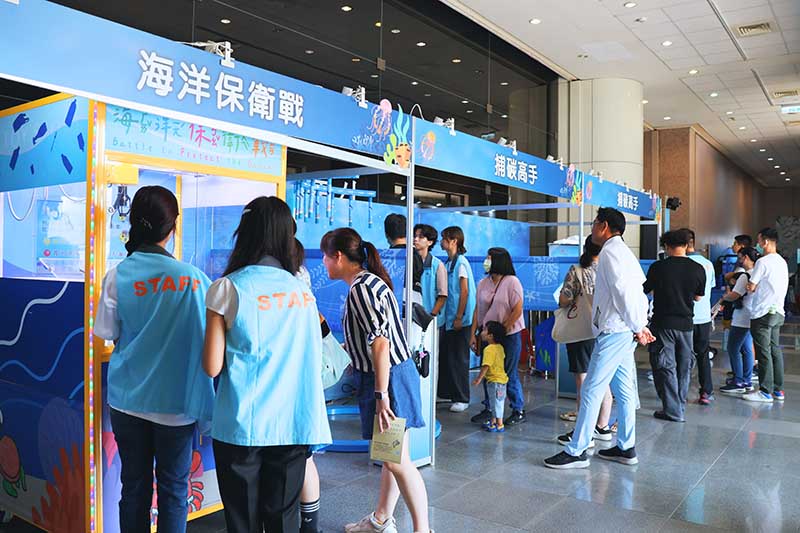 2025海洋教育嘉年華今日開跑,於科博館地球環境廳2樓迴廊及中臺灣海洋保育教育中心周邊展出豐富的互動教具,圖為關卡「行動愛海洋」。圖片提供/國立自然科學博物館