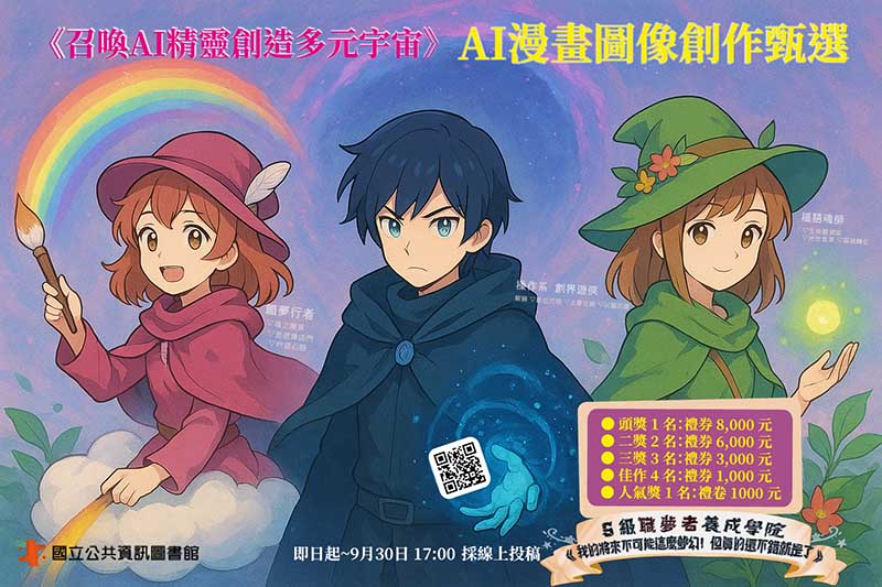 國立公共資訊圖書館以「我的未來職業想像」為主題,舉辦「召喚AI精靈創造多元宇宙──AI漫畫圖像創作甄選」,鼓勵14至22歲青少年運用AI生成的圖像素材,改編創作漫畫風格的海報式作品,在114年9月30日前都可以網路投稿,期許青少年能運用創新思維和數位科技,把腦中閃現的靈感在畫面上逐步成形,創意描繪自己的夢想藍圖。