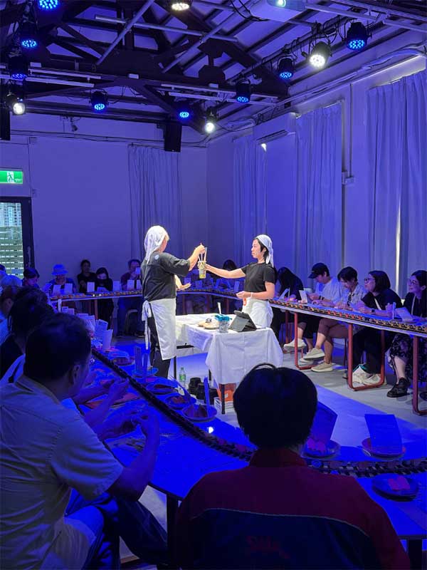 藝術家 莊毅柔 把壽司旋轉檯化為社群平台,主廚扮演「系統工程師」,帶領觀眾體驗社群平台的瘋狂與趣味