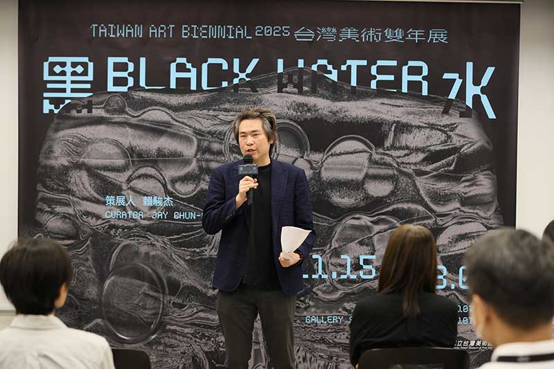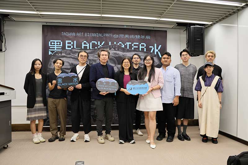 國美館主辦的「黑水――2025台灣美術雙年展」,將於11月15日星期六開展,今(8)日舉行記者會,正式公布本屆參展藝術家完整名單,並於YouTube平臺推出前導影片,宣告進入開展倒數。記者會現場由國立臺灣美術館館長陳貺怡主持,策展人賴駿杰與參展藝術家王鼎曄、吳家昀、吳梓安、李慈湄、李鍵、林安狗、郭佩奇、郭悅暘 ljalje’elan patadalj、陳飛豪等人到場共襄盛舉,場面熱烈。