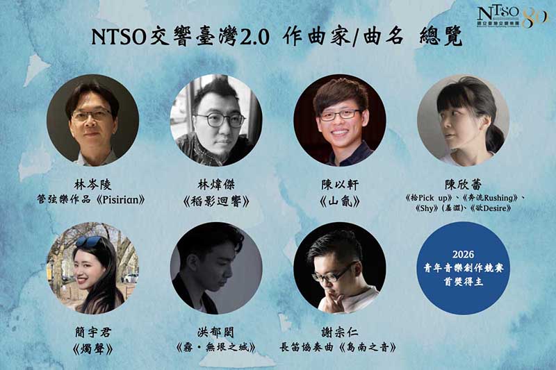 NTSO國立臺灣交響樂團邁入創團80週年,正式啟動「交響臺灣2.0」。繼第一階段以臺灣文學為靈感,完成九部新創作品之後,第二階段以「臺灣美術」為核心,經由國內外知名作曲家評選出七位中青世代作曲家,從畫作中汲取靈感,將色彩與筆觸化為旋律與樂章。七部新作預計於2026年完成,並將由NTSO世界首演及出版。此外,2026年「青年音樂創作競賽」首獎得主亦將獲得「交響臺灣2.0」委託創作合約,使計畫最終涵蓋八部新作,象徵樂團邁向新十年的嶄新篇章。