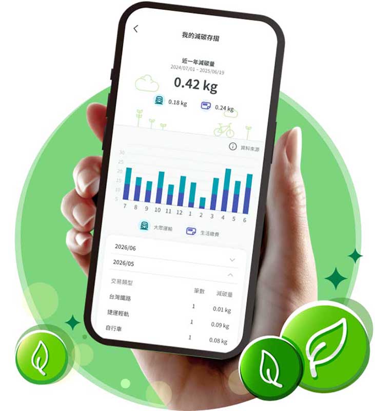 用戶能便利地查詢個人每月搭乘大眾運輸及綠色消費的減碳量,有效提升大眾的永續意識與實踐意願。累積個人減碳數據亦相當簡便,用戶只需下載並更新「一卡通iPASS MONEY」APP 至最新版本,即可從 APP 首頁右上角一覽近一年的總減碳量,點選後更能深入了解每月數據及詳細資訊,凡使用一卡通記名卡搭乘大眾運輸或透過APP 進行「生活繳費」響應無紙化帳單,皆能輕鬆累積您的減碳數據。
