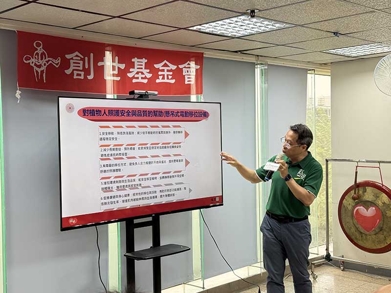 創世台中院長陳韋龍表示,非常感謝國際獅子會300C-1區集結獅友們的愛心,幫助台中院募集「懸吊式電動移位設備」及更換院區老舊空調設備等經費。台中院有6間寢室,安養30位植物人,亟需新設備建置、導入科技輔具,提升植物人在移動過程中的安全性與舒適度,打造更安全、有尊嚴的照護環境。