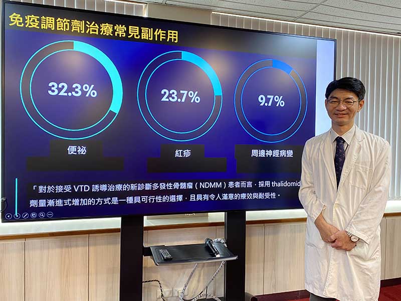 滕傑林解釋,多發性骨髓瘤確切病因不明,醫學推測與基因變異相關,無有效預防方法也無法完全根治。但隨著新藥、免疫療法與自體造血幹細胞移植進步,越來越多病人得以長期控制病情,維持良好生活品質。關鍵在於治療中有效降低副作用,幫助病人完成療程。傳統治療一開始給高劑量,常見手腳麻木、便祕或皮膚疹等副作用導致治療中斷,臺中榮總創新劑量調整治療模式─從低劑量逐步調整至標準劑量,漸進式給藥大幅降低副作用,提升病人完成療程比率,研究成果發表於 《Cancer Reports》。