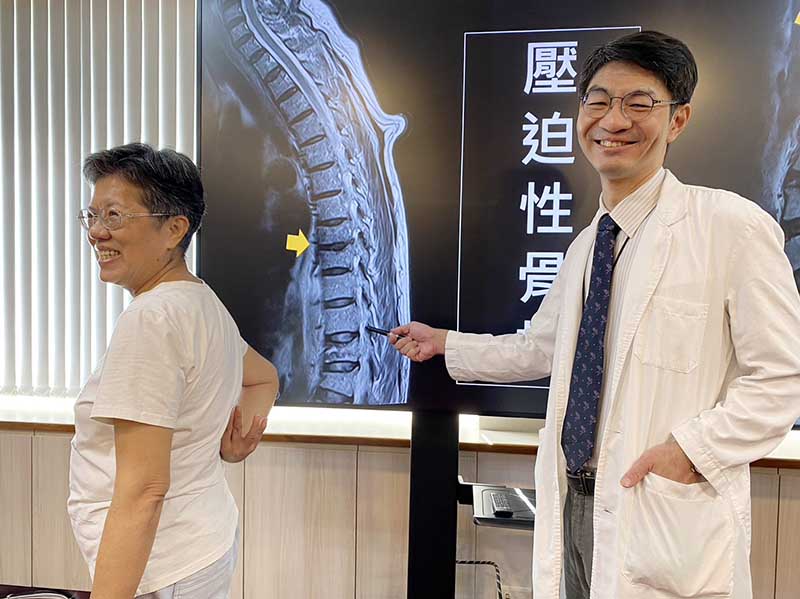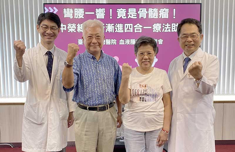 62歲宋女士兩年前照顧母親彎腰時,下背部突然「啪」一聲,3個月內從痠痛轉為劇痛,復健、針灸都無效,連起床、如廁、走路都困難,形容自己「舉步維艱」。磁振造影確認第12節胸椎壓迫性骨折,骨科林育賢醫師施行脊椎骨泥灌漿成形手術,病理切片確診多發性骨髓瘤。血液腫瘤科滕傑林主任接手治療,採用臺中榮總創新的「漸進式免疫調節劑量策略」降低副作用,讓她完成最新四合一標靶藥物治療並接受自體造血幹細胞移植。