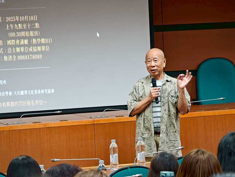 吳炫三老師以「探索」與「創新」為人生主軸,長年遊歷亞洲、非洲及南美洲等地,以藝術家的敏銳觀察力,描繪人類文明與自然共生的樣貌。講座中,他以自身探訪不同文化與地景的經驗為例,闡述「藝術不僅是形象的再現,而是與生命對話的過程」。他指出「藝術家要學會傾聽自然,感受時間的呼吸,讓文化在新的時空中重生。」其作品以自然材質與人文精神為創作核心,展現對土地、歷史與文化的深刻敬意,引領聽眾穿梭於不同文明的交會之間,體會藝術跨越地域與時間的無限可能。