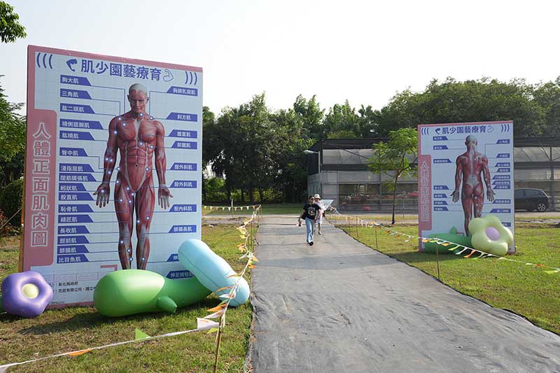 興大規劃的「肌少園藝療育區」共規劃三大展區,透過教育、展示與互動,讓民眾認識園藝療育的原理與效益。包含入口意象區,以人體肌肉與骨骼結構為主題,介紹肌少症成因、阻力運動概念與園藝療育的應用;園藝療育探索區,展出24組園藝造景作品,依運動強度與技巧難易度分類,民眾可透過導覽與集章體驗,學習各種園藝動作如何訓練不同肌群;園藝療育互動體驗區,設有「手部阻力」、「修剪阻力」、「重量訓練」與「活動強度體驗」四大主題區,參與者可實際體驗修剪、搬運、翻土等動作的阻力變化,感受園藝活動如何活化肌力、促進穩定度。