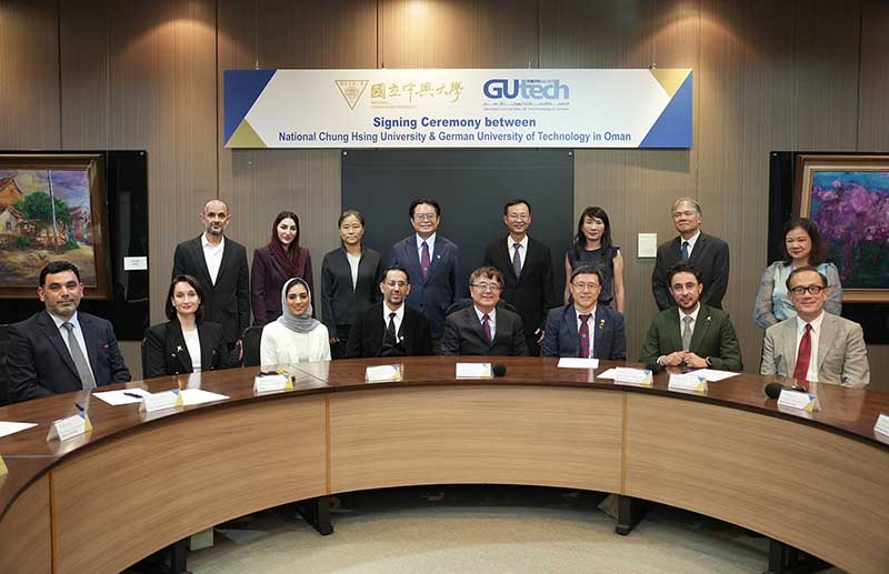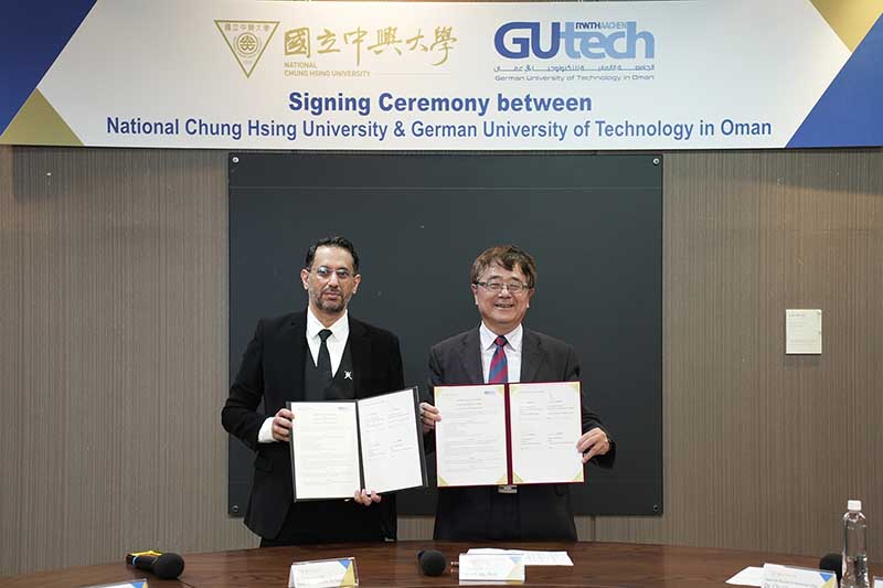 簽約儀式於中興大學舉行,由興大詹富智校長與GUtech副校長兼上議員 Hon. Dr. Hussain Al Salmi 代表雙方簽署,外交部鄧盛平公使、教育部國際及兩岸教育司曾競簡任秘書,以及阿曼駐台代表穆罕莫德·阿巴拉米(Mohammed Muslem Said Al Baraami)親臨見證,充分展現臺阿雙方政府與學術界對此合作的高度重視。
