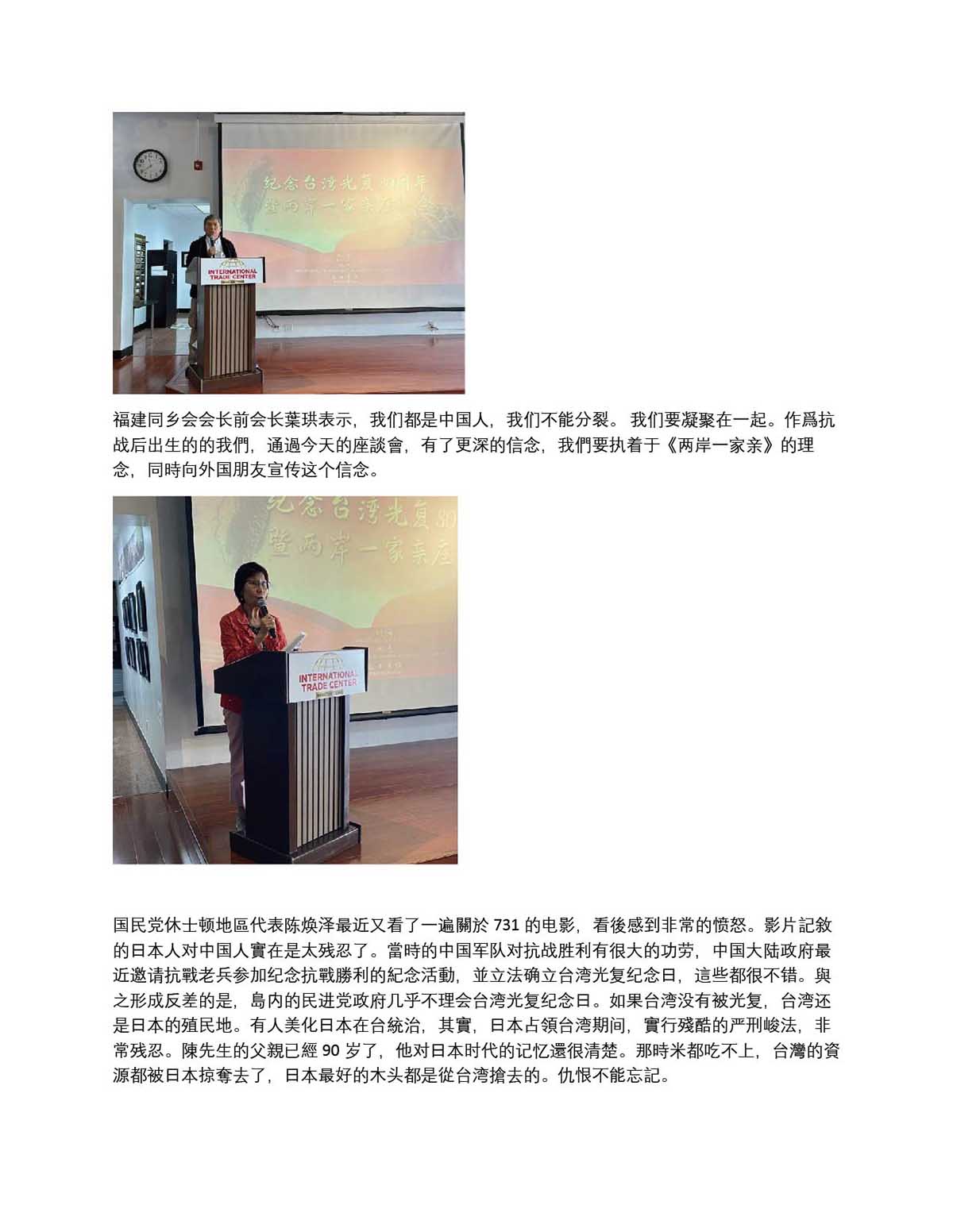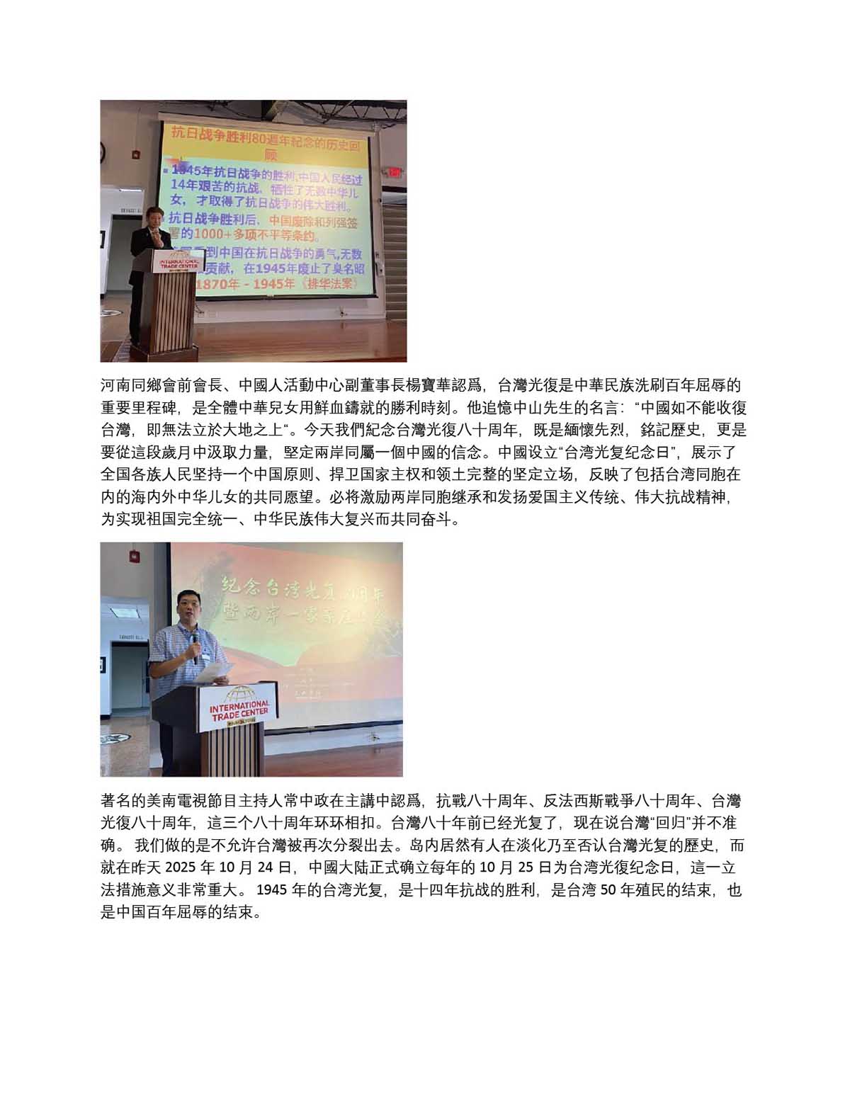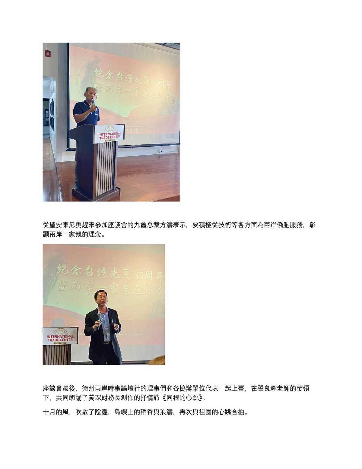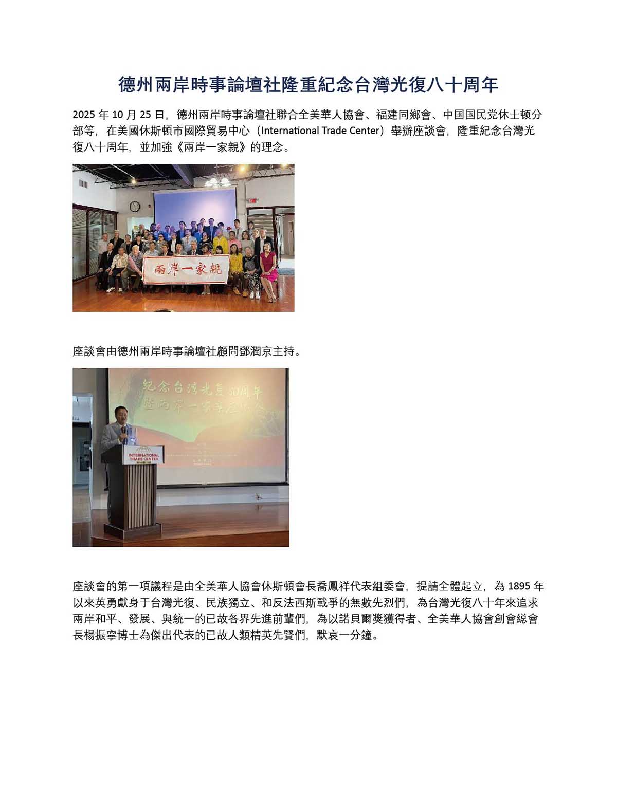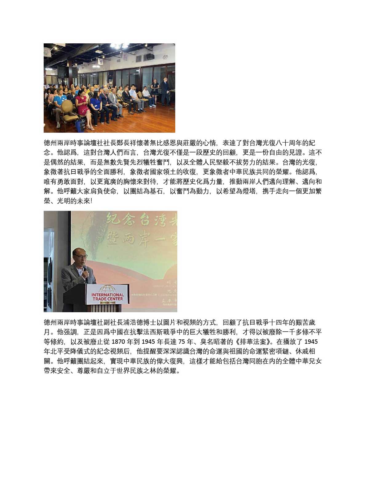德州兩岸時事論壇社 隆重紀念台灣光復八十周年