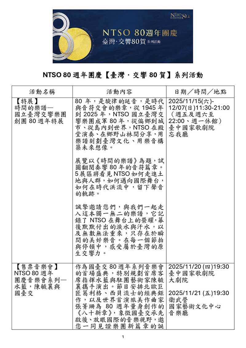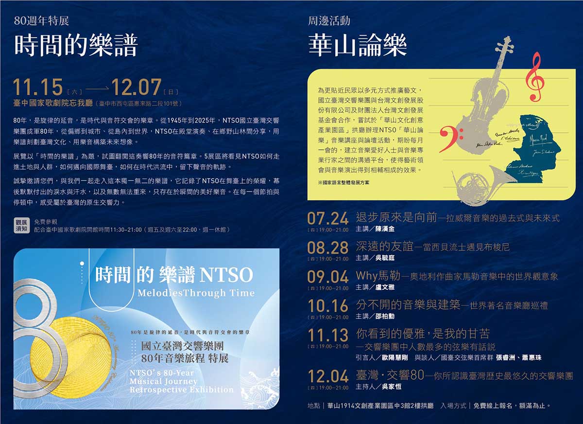 延續回望過去的精神,NTSO特別企劃《時間的樂譜》特展及《蓄銳80》專書出版。共同記錄NTSO在舞臺上的榮耀、幕後的汗水與淚水,以及那些只存在於瞬間的美好樂音。在每一個節拍與停頓中,觀眾將感受屬於臺灣的原生交響力。特展將自11月15日起至12月7日止在臺中國家歌劇院忘我廳展出,帶領觀眾從省交時代到今日國臺交的發展歷程,見證80年來音樂與社會的共同呼吸。專書《蓄銳80》則由編輯吳家恆統籌策劃,承襲徐麗紗教授《山鳴谷應 風起水湧》的研究觀點,將國臺交的歷史脈絡延伸至日治時期,以豐富史料與訪談重構臺灣交響樂的80年軌跡。書名《蓄銳80》象徵樂團在歲月的積累中不斷蓄積能量,準備迎向新的樂章,也見證了半部戰後臺灣音樂史的誕生與延續。