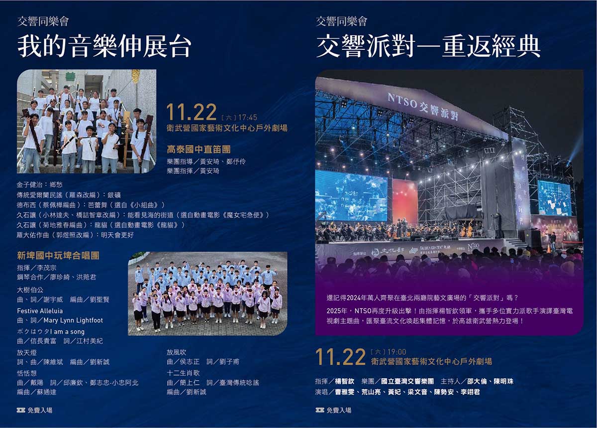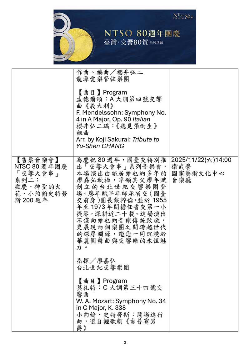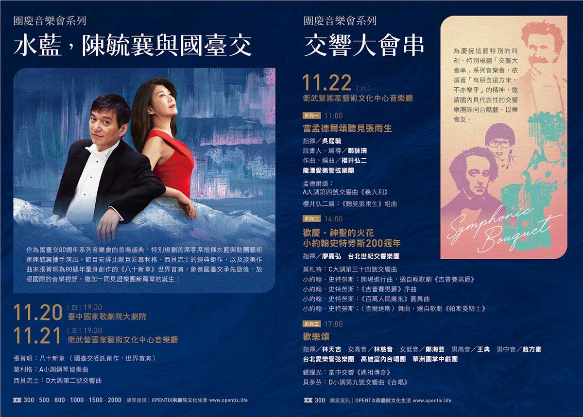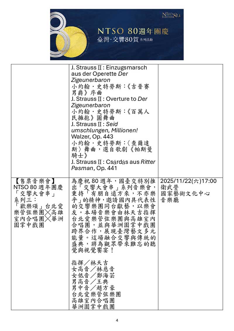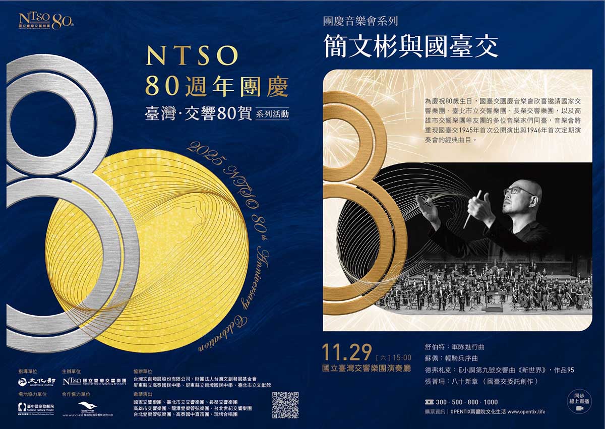 系列活動壓軸的《簡文彬與國臺交》,由簡文彬指揮與NSO國家交響樂團郭玟岑執行長、TSO臺北市立交響樂團郭佩瑜團長、KSO高雄市交響樂團朱宏昌執行長、ESO長榮交響樂團柯文玲協理共同登台獻上祝福。這場演出將由臺灣五大職業交響樂團同台演出,開創臺灣交響史上前所未有的盛舉,並重現1945年創團音樂會及1946年第一次定期演奏會曲目——舒伯特《軍隊進行曲》、蘇佩《輕騎兵序曲》與德沃札克《新世界交響曲》,讓歷史在現場重響,象徵跨團合作與共榮共融的時代精神。