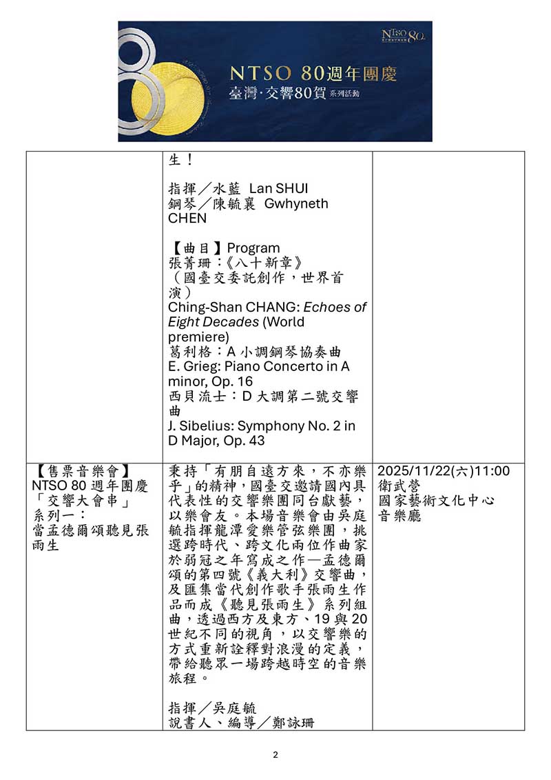 歐陽慧剛團長最後指出:「不只是創作計畫,而是樂團與土地之間持續對話的樂章。從文學到美術,我們以音樂延伸文化記憶,也讓世界透過這份聲音,看見臺灣的文化底蘊。」他強調,「交響臺灣2.0」是NTSO 80週年系列活動的起跑點,也是樂團邁向下一個世代的重要里程碑。